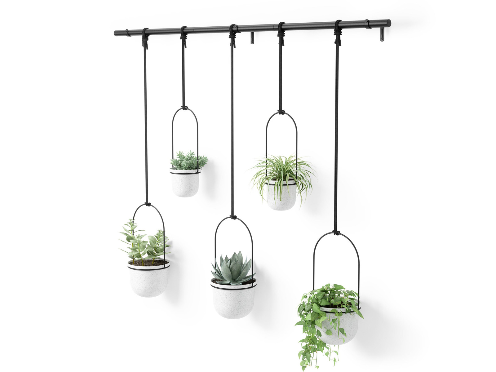 Oryginalny pokojowy poziomy wiszący kwietnik z 5-oma melaminowymi osłonkami na doniczki z kwiatami, ziołami, pnączami i innymi roślinami z domowych hodowli.
