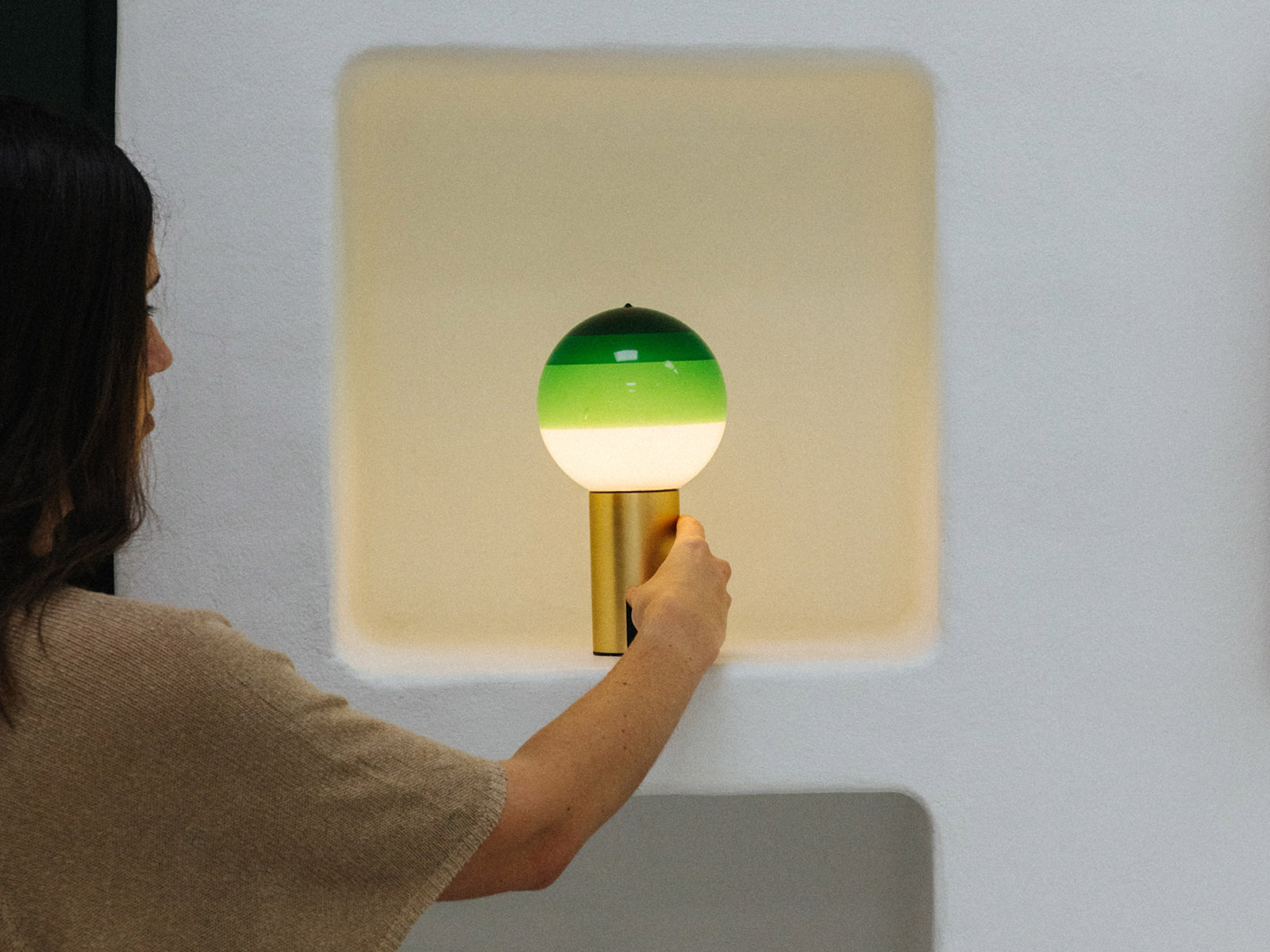 Marset Dipping to flagowa kolekcja lamp marki Marset, w tym również kolekcja oryginalnych bezprzewodowych lamp ledowych zaprojektowanych przez Jordi Canudas dla Marset. Stylistycznie lampa Dipping zadziwia swoim prostym, a jednocześnie oryginalnym projektem. Piękną kompozycję i jednocześnie piękne proporcje uzyskano dzięki zastosowaniu kształtów podstawowych brył geometrycznych, kuli jako klosza oraz walca jako podstawy. Podstawa wykończona jest na kolor złoty matowy. Elementem najbardziej charakterystycznym jest jednak klosz, który jest warstwowo malowany dając piękny klimatyczny efekt.