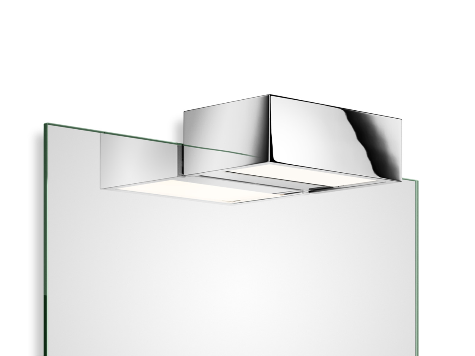 Elegancka lampa o prostokątnym kształcie, kinkiet o długości 15 cm przypinany bezinwazyjnie na górny brzeg lustra.
