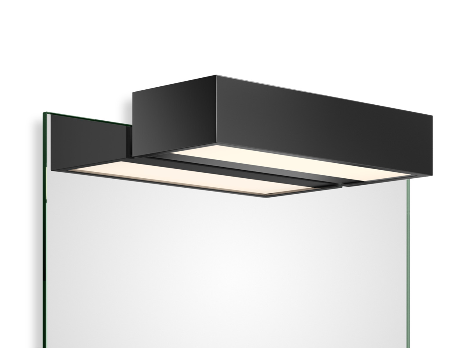 Elegancka długa lampa o prostokątnym kształcie, szeroka listwa o długości 25 cm przypinana bezinwazyjnie na górny brzeg lustra.