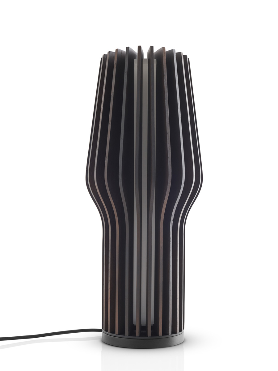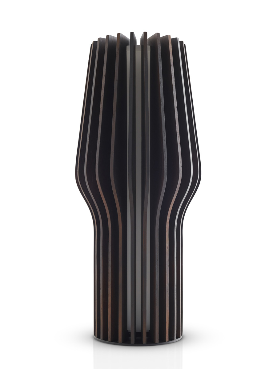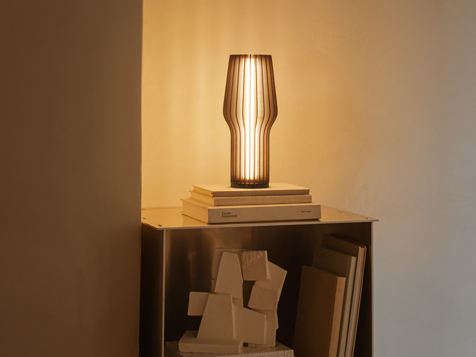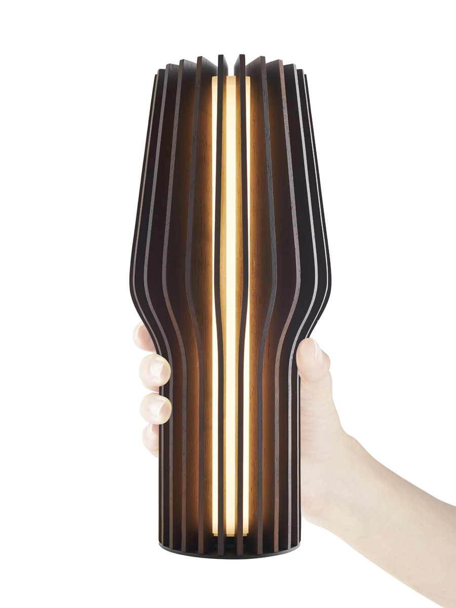 Oryginalna dekoracyjna przenośna lampka nablatowa z odświetleniem LED obudowanym drewnianą żeberkową konstrukcją.