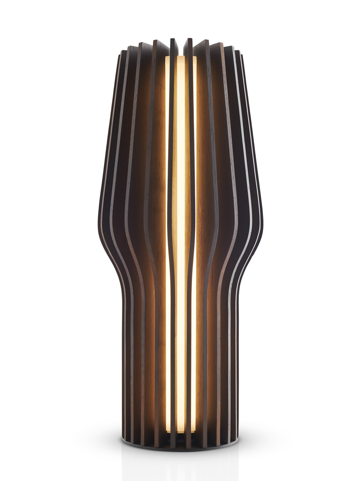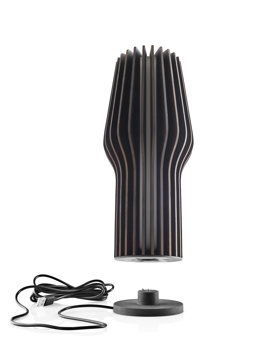 Lampka wykonana z naturalnego dymionego drewna dębowego, bezprzewodowa, ładowana za pomocą podstawki z ładowarką z przewodem USB.