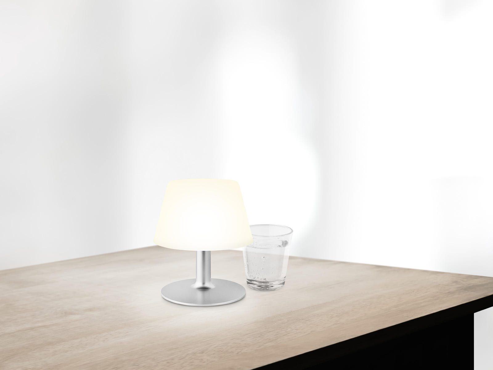 Elegancka dekoracyjna solarna stołowa lampa LED zasilana promieniami słonecznymi do całorocznego użytku na zewnątrz.
