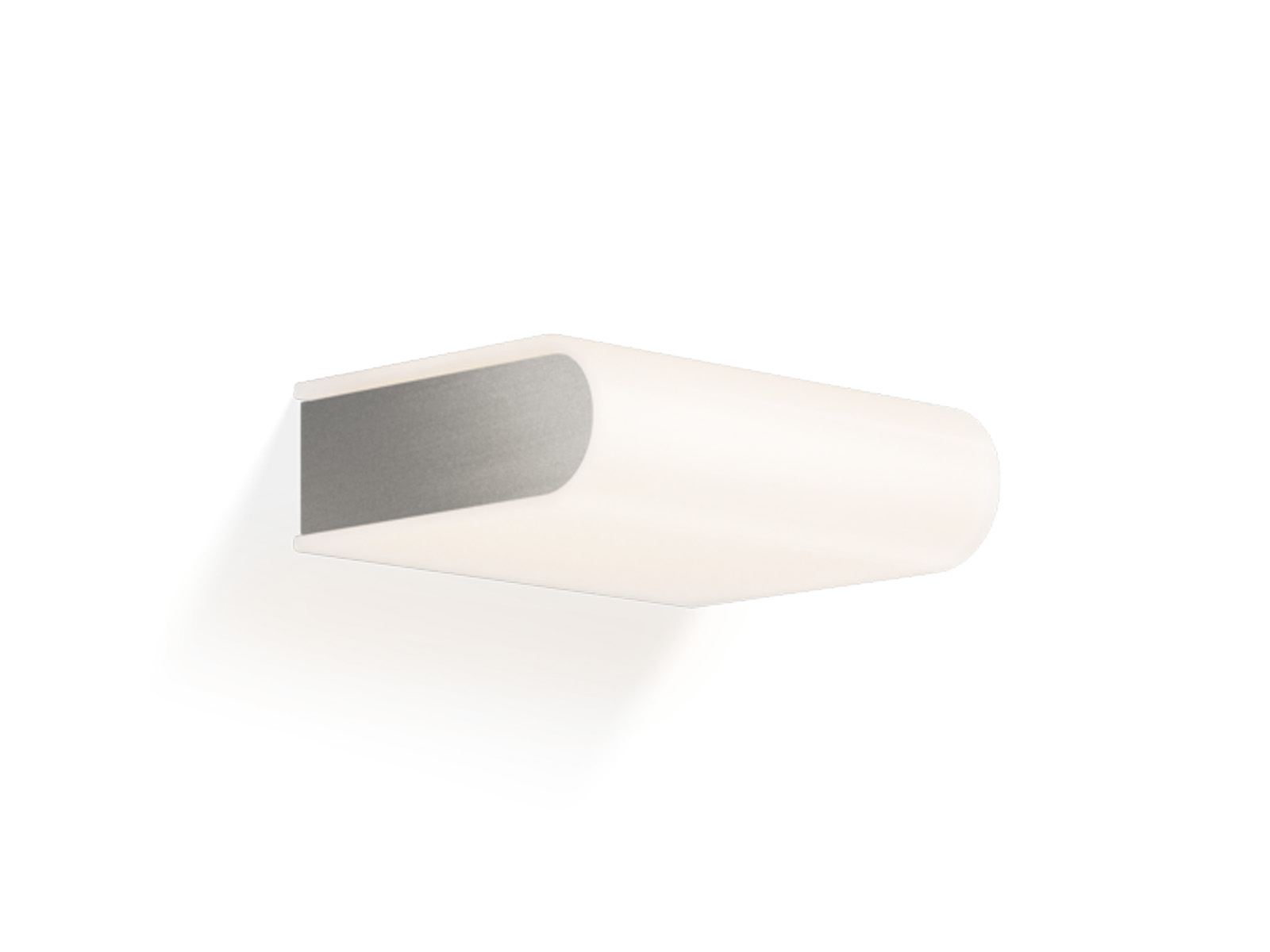 Lampa z płaskim kloszem o zaokrąglonej przedniej ściance, wykonanym z wytrzymałego białego matowego szkła i bokami z wysokiej jakości niklowanego mosiądzu w wykończeniu matowym - patrząc z boku kształt lampy przypomina złożoną książkę.