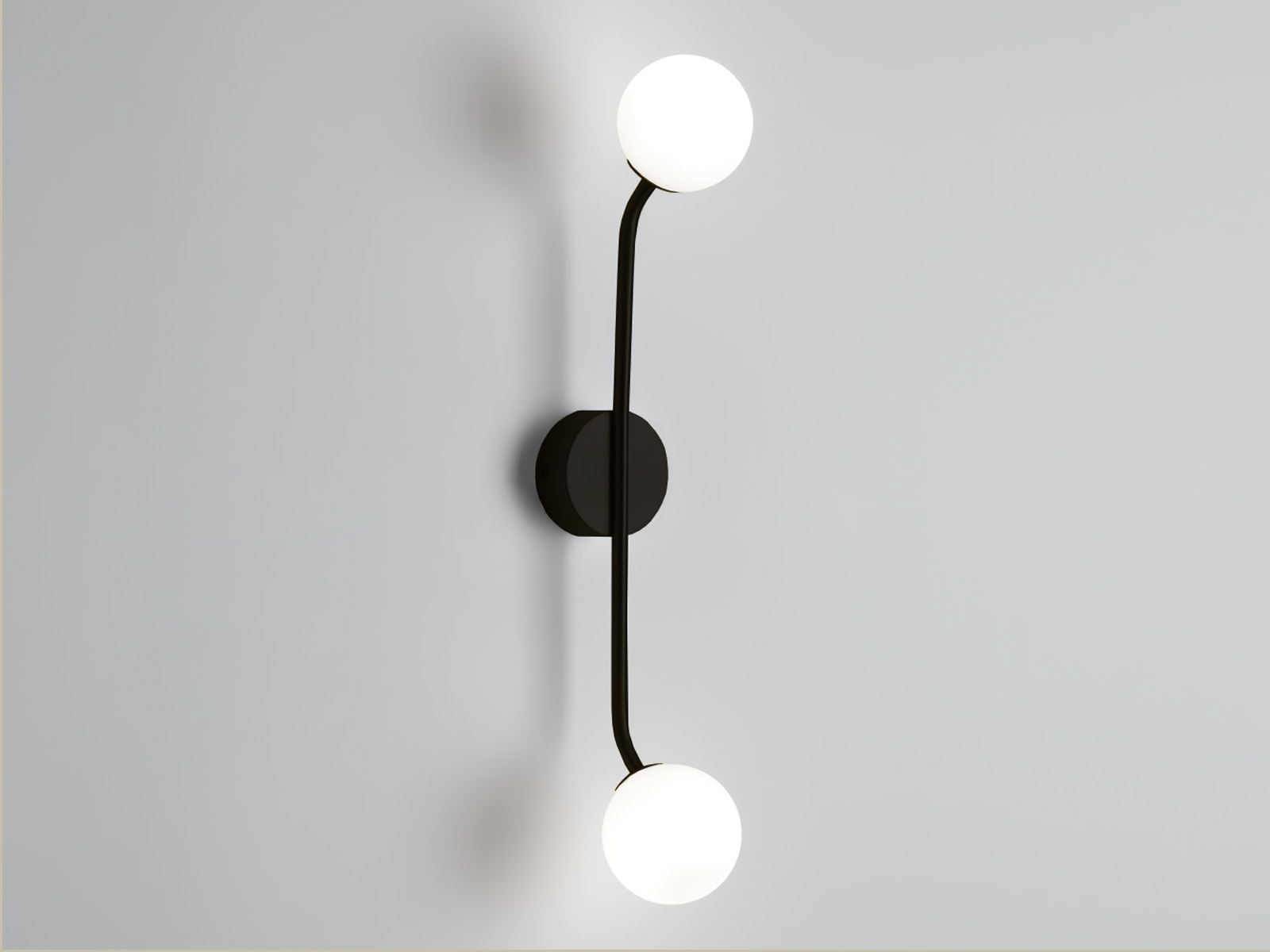 Elegancka ścienna lampa z 2-oma okrągłymi niewielkimi kloszami osadzonymi na dwóch ramionach, idealna do oświetlenia zarówno łazienki, przedpokoju i salonu.