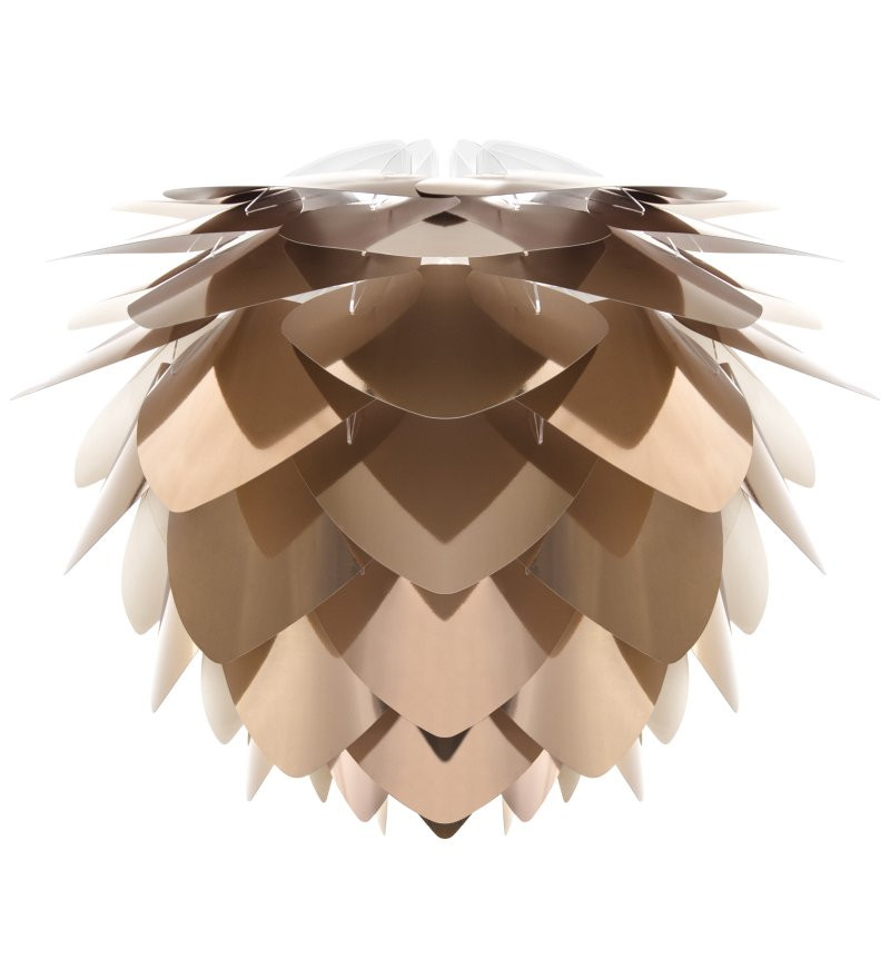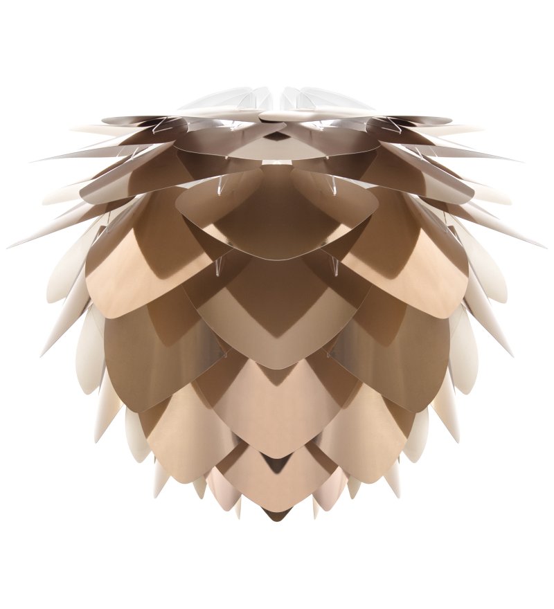 Lampa UMAGE Silvia z kolekcji Core Line to nawiązanie do klasyki duńskiego designu. Intrygująca forma, ponadczasowa linia i skandynawski charakter tworzą niepowtarzalny klimat w niejednym wnętrzu. Wersja bronze w kolorze metalicznego, szczotkowanego brązu powstała z myślą o wszystkich tych, którzy chcą wprowadzić do domu ciepłe i modne kolory. Ta wyselekcjonowana kolorystyka to także nawiązanie do najnowszych trendów w wyposażeniu wnętrz. Poszczególne listki lampy Silvia Bronze wykonane są z elastycznego tworzywa, które z jednej strony pokryte jest kolorową metaliczną folią, a od strony wewnętrznej zachowuje biały kolor. Dzięki temu rozwiązaniu otrzymujemy produkt dekoracyjny, lecz dobrze rozpraszający światło.