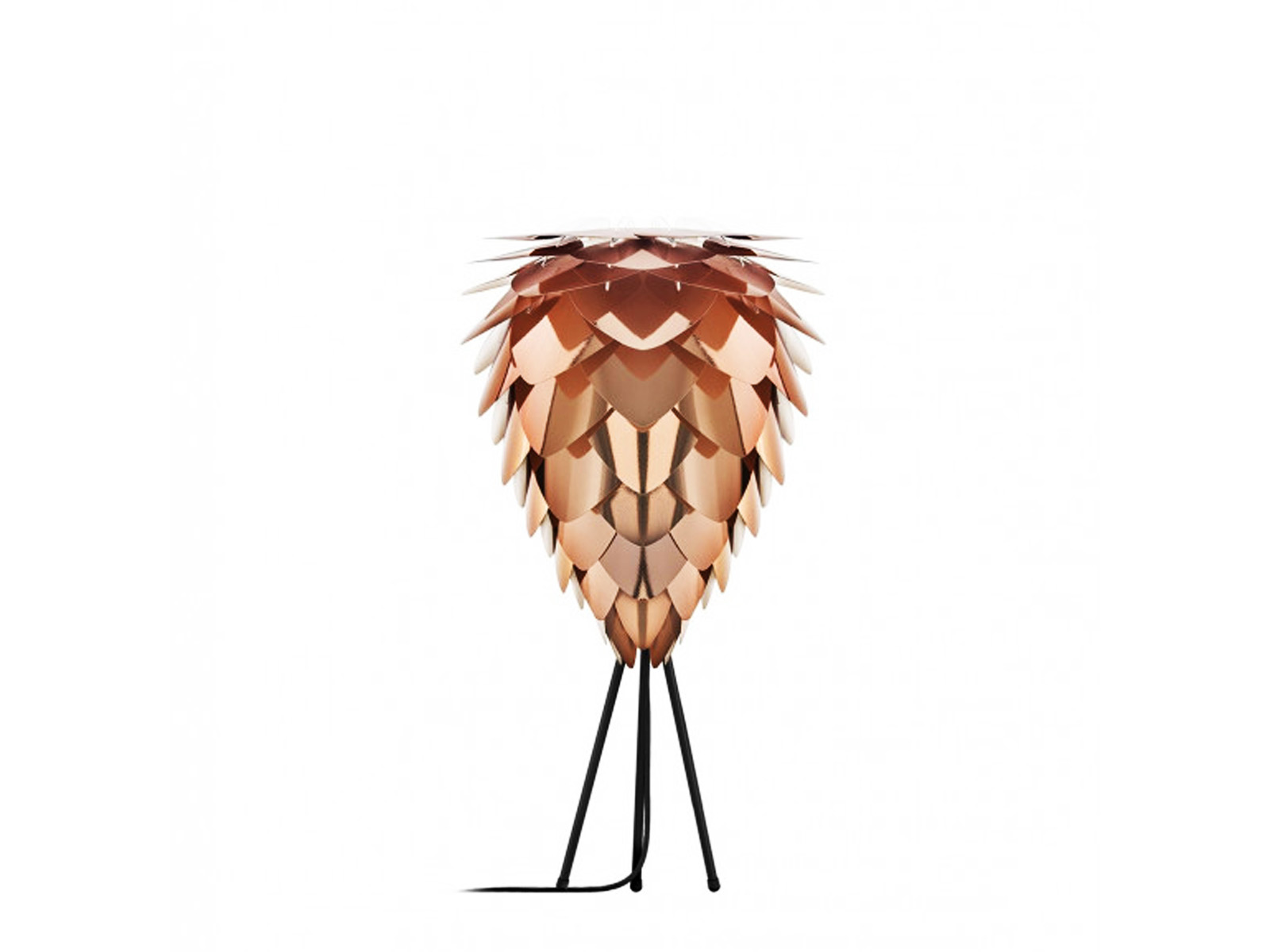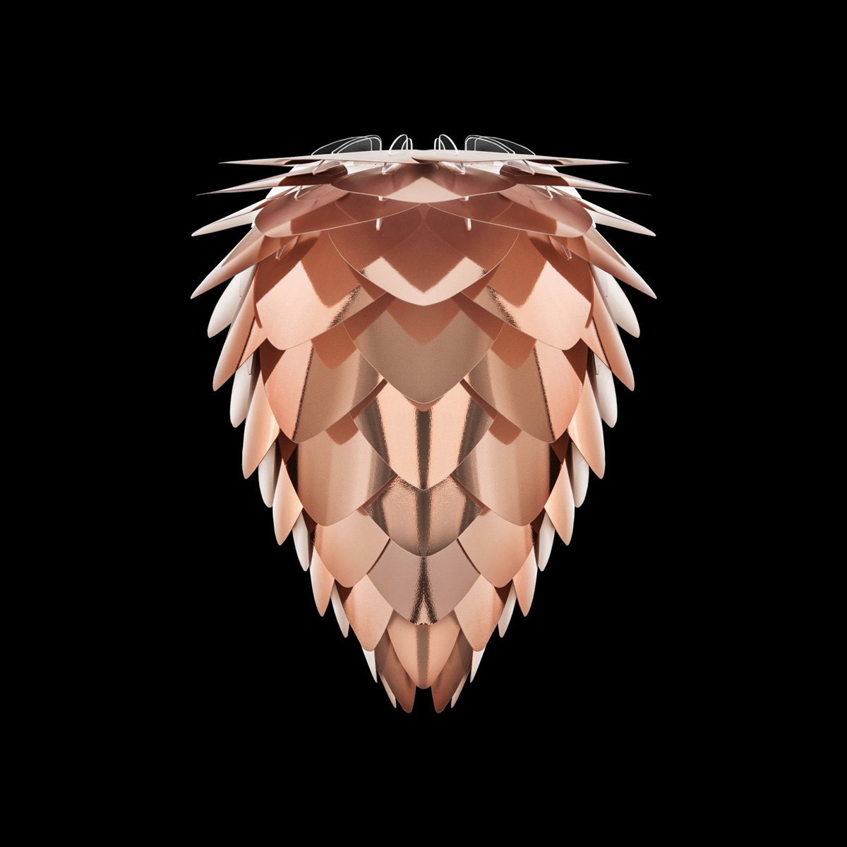Klosz lampy wieloelementowy w stożkowatym kształcie przypominającym szyszkę o średnicy 40 cm, wykonany z tworzywa sztucznego - każdy z jego listków jest biały z jednej strony i miedziany z drugiej.