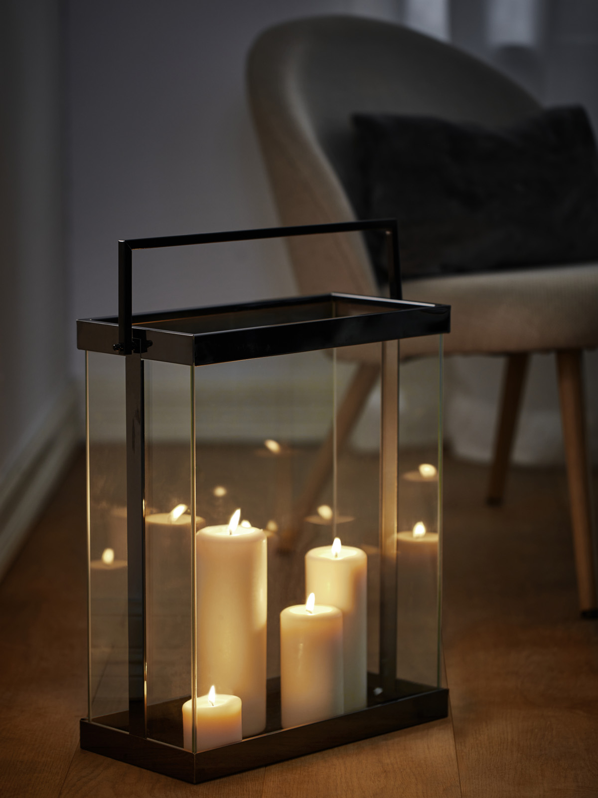 Elegancki dekoracyjny lampion na świece o prostokątnym geometrycznym kształcie do użytku zarówno w pomieszczeniach jak i na zewnątrz.