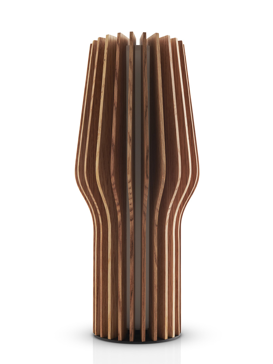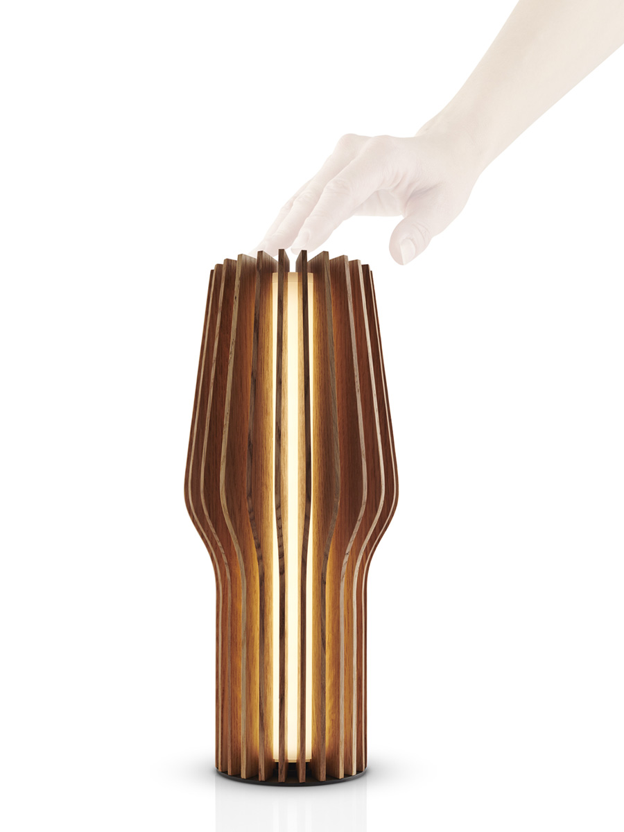 Oryginalna dekoracyjna przenośna lampka nablatowa z odświetleniem LED obudowanym drewnianą żeberkową konstrukcją.