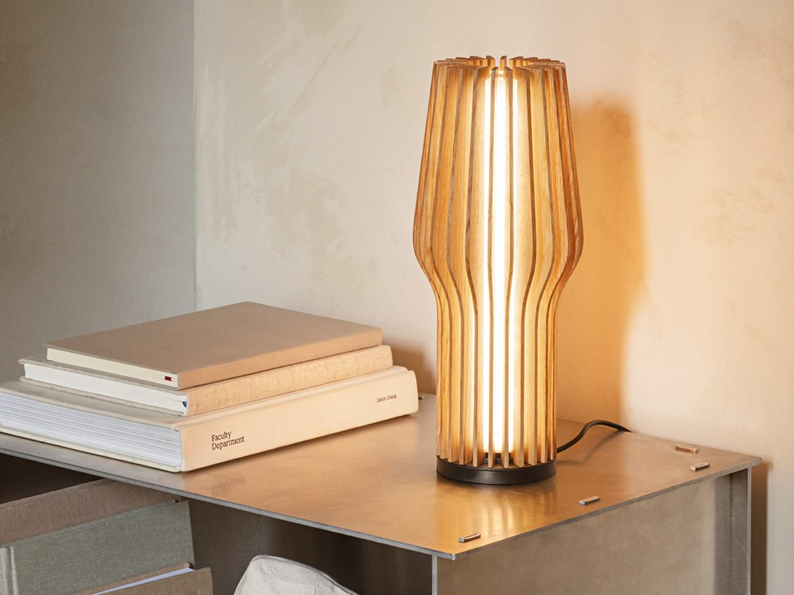 Lampa wykonana z naturalnego drewna dębowego, bezprzewodowa, ładowana za pomocą podstawki z ładowarką z przewodem USB.