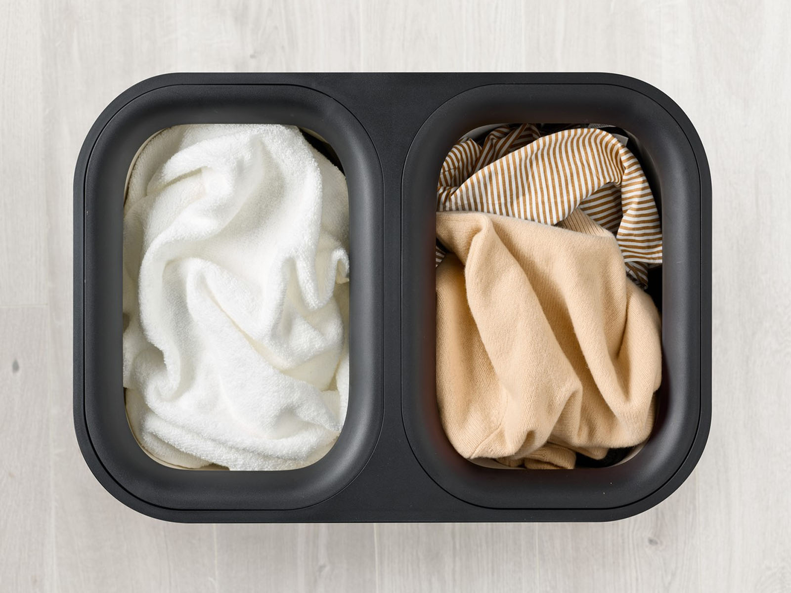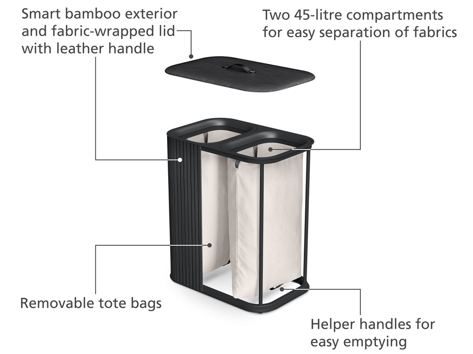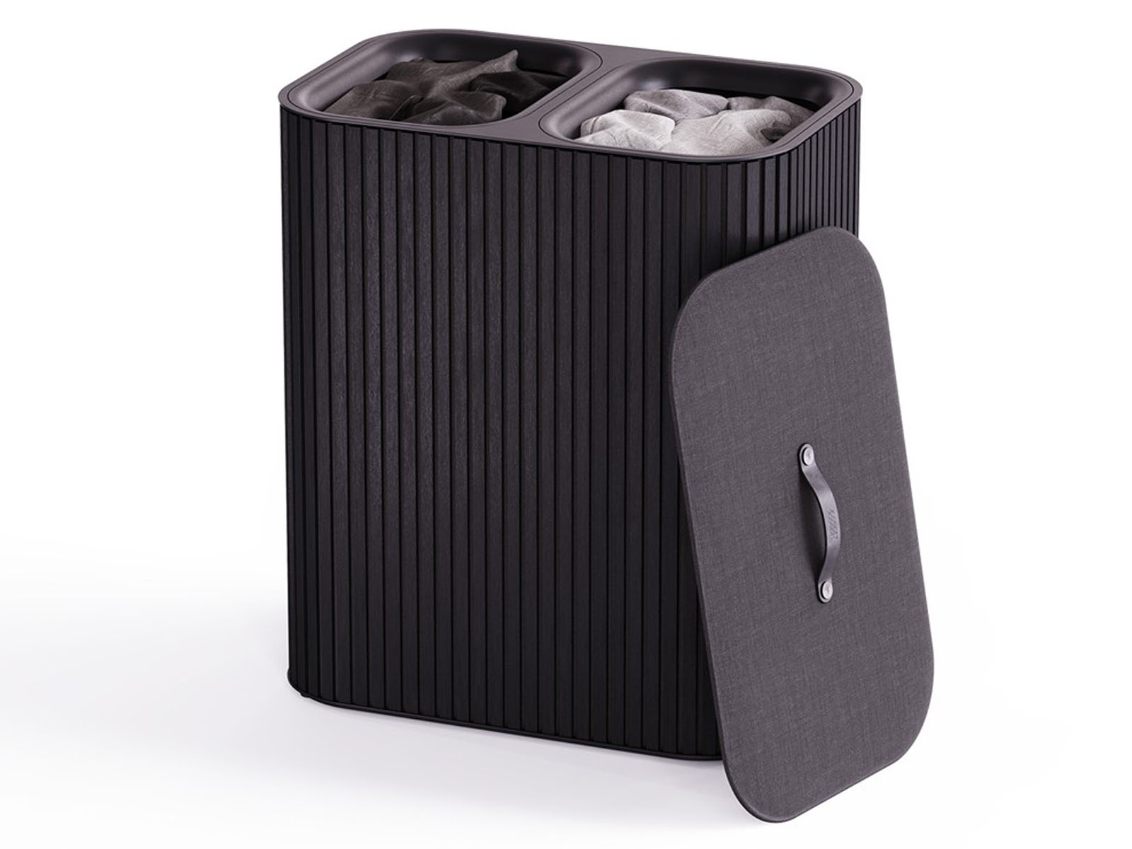 Pokrywa ze skórzanym uchwytem, wykończona tkaniną, pozwala estetycznie schować zawartość kosza o 2-komorowej konstrukcji. Każda komora segregacyjna stwarza przestrzeń na 45 litrów prania.