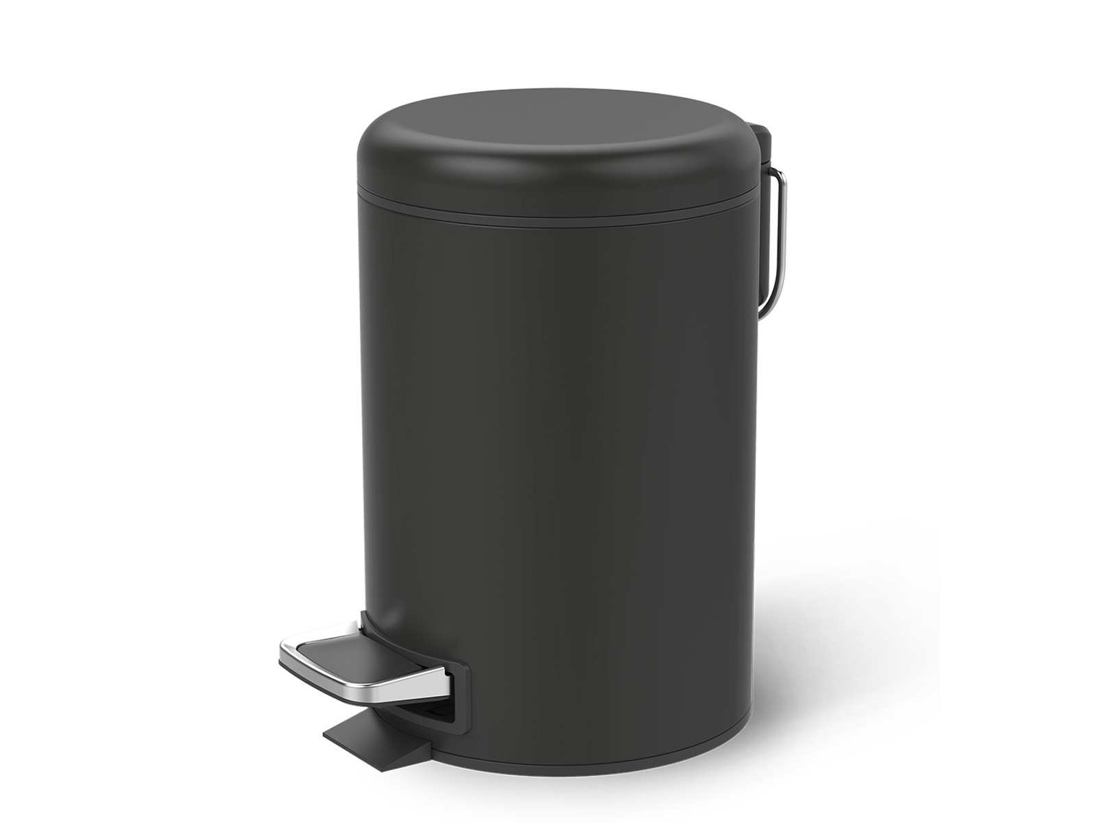 Elegancki łazienkowy kosz na śmieci o cylindrycznym kształcie z klapą automatycznie otwieraną poprzez naciskany stopą pedał.