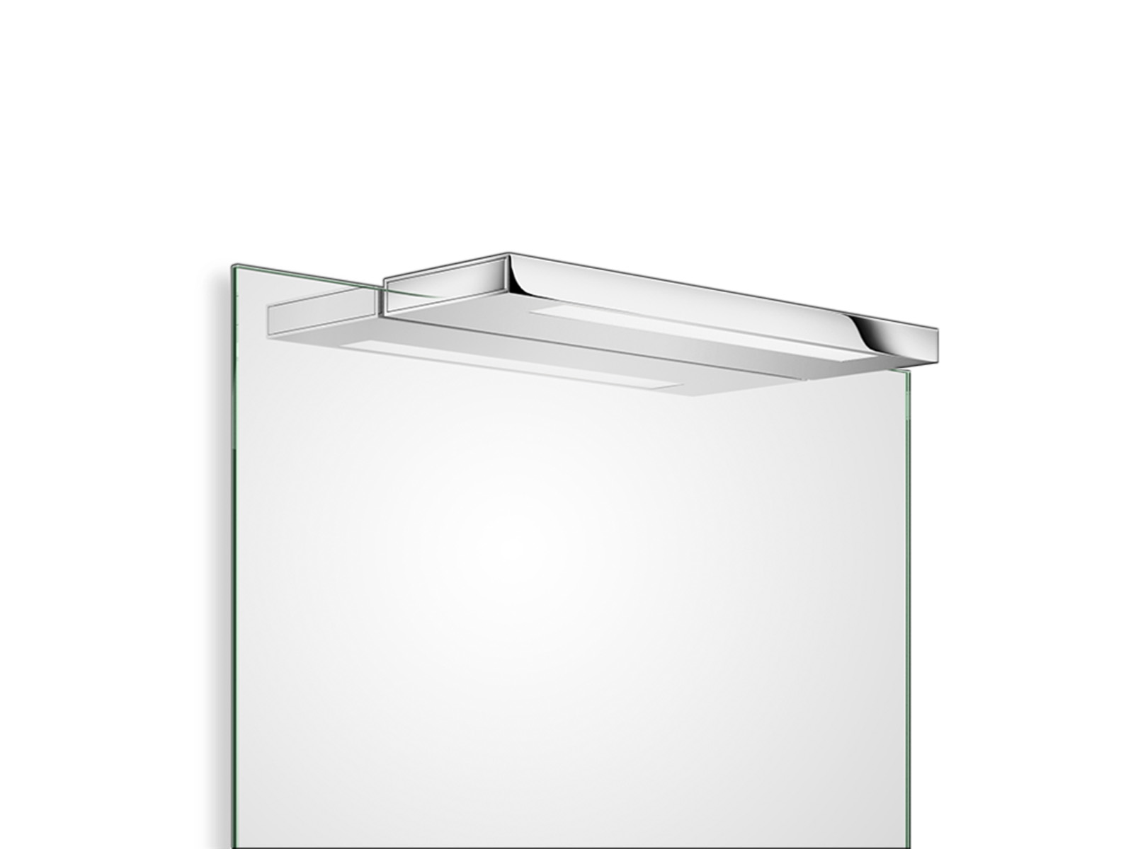 Elegancka płaska długa lampa o prostokątnym kształcie przypinana bezinwazyjnie na górny brzeg lustra.