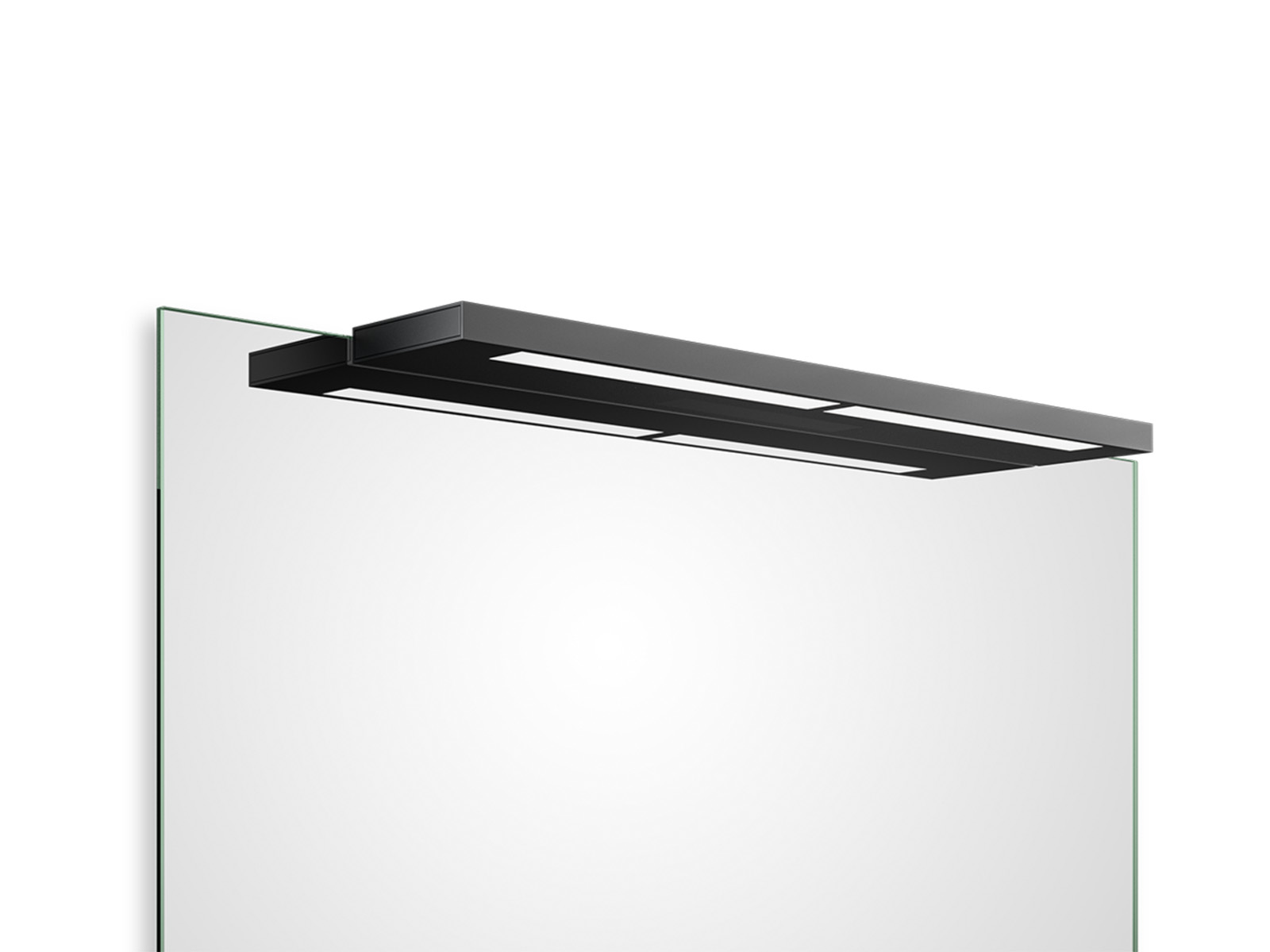 Elegancka płaska długa lampa o prostokątnym kształcie przypinana bezinwazyjnie na górny brzeg lustra.