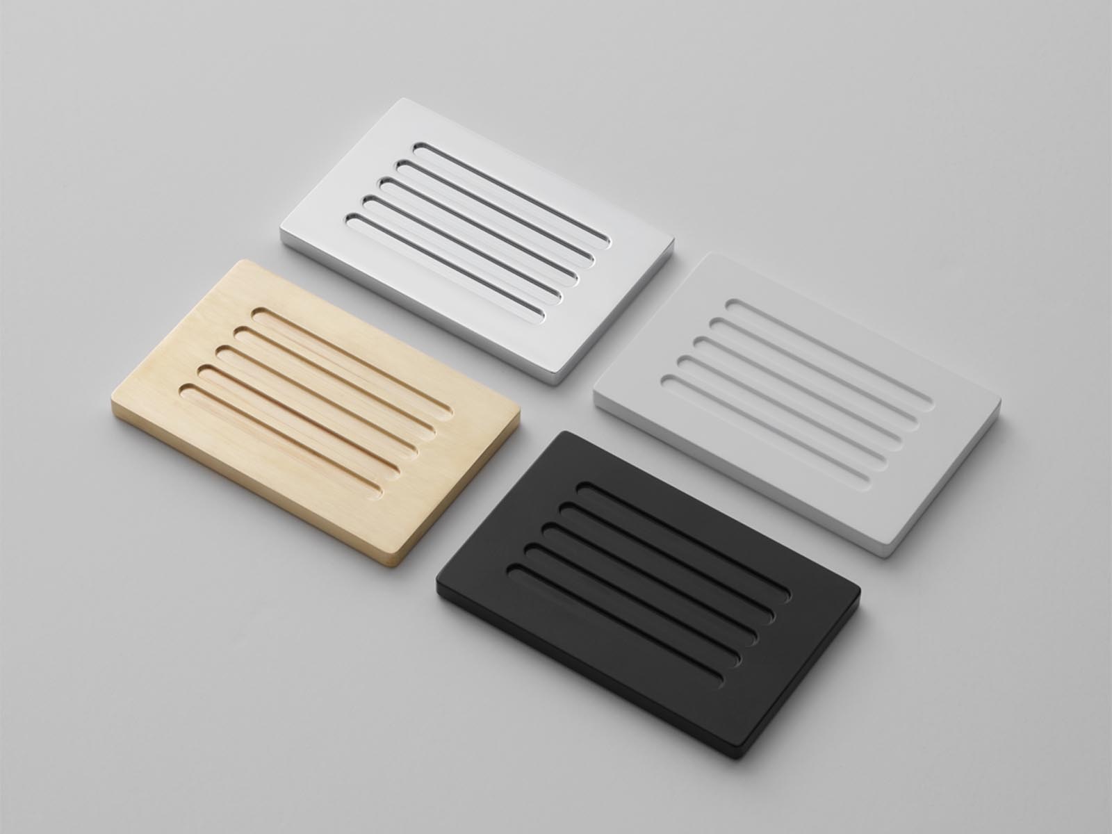 Mydelniczka prostokątna płaska o lekko zaokrąglonych rogach z ociekaczem z pięcioma rowkami.