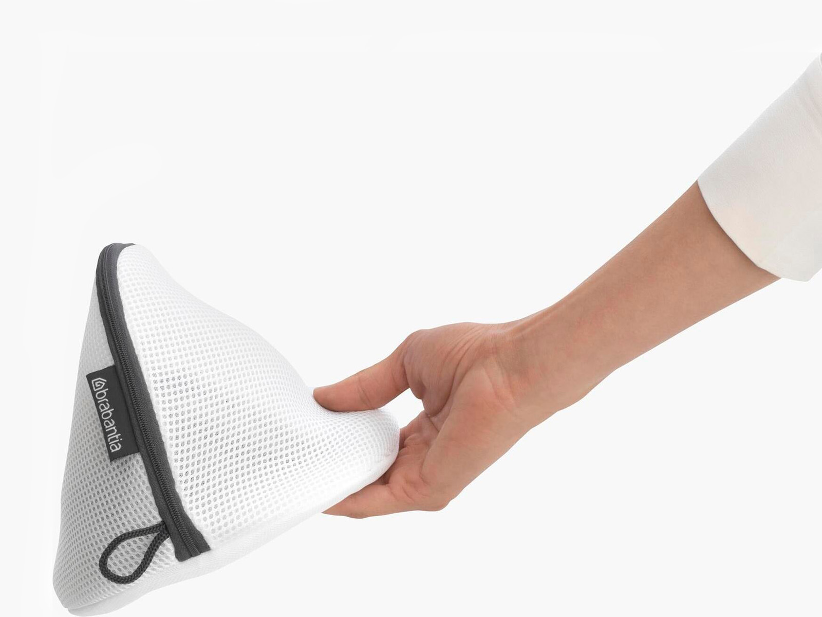 Torebka wykonana z ażurowej tkaniny siateczkowej, zapinana na zamek błyskawiczny ze specjalną osłonką na języczek chroniącą inne prane rzeczy i pralkę.