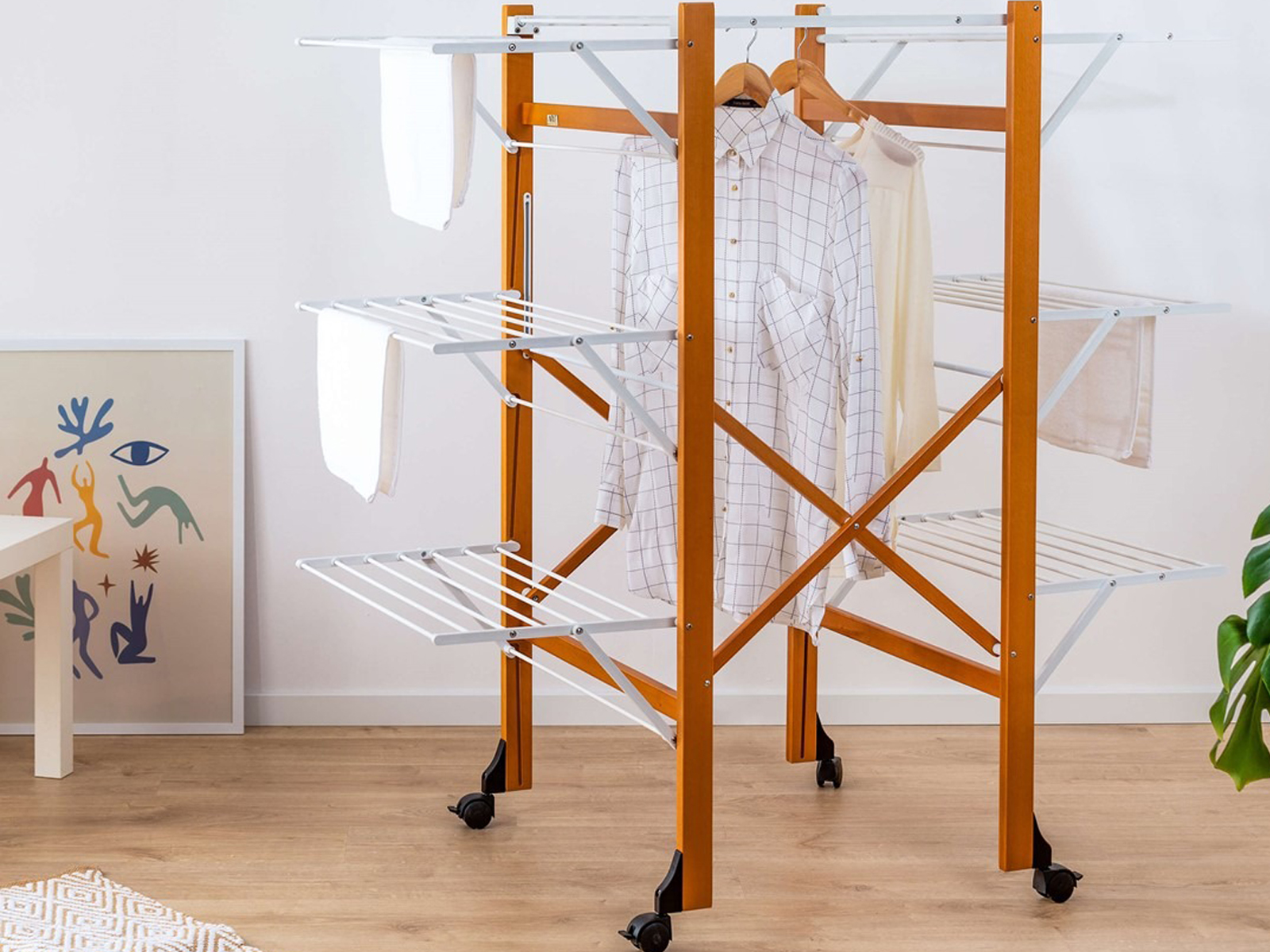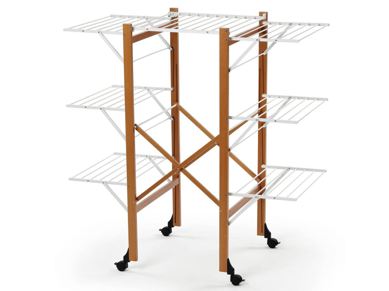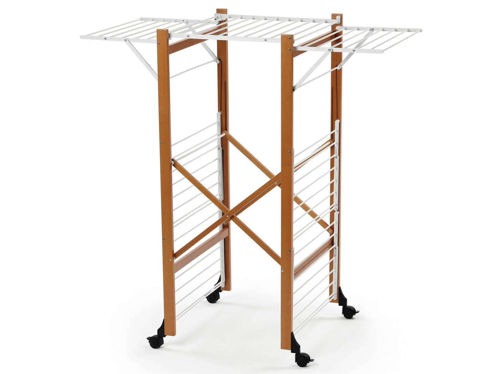 Funkcjonalna suszarka na pranie z drewnianą konstrukcją i kółkami
