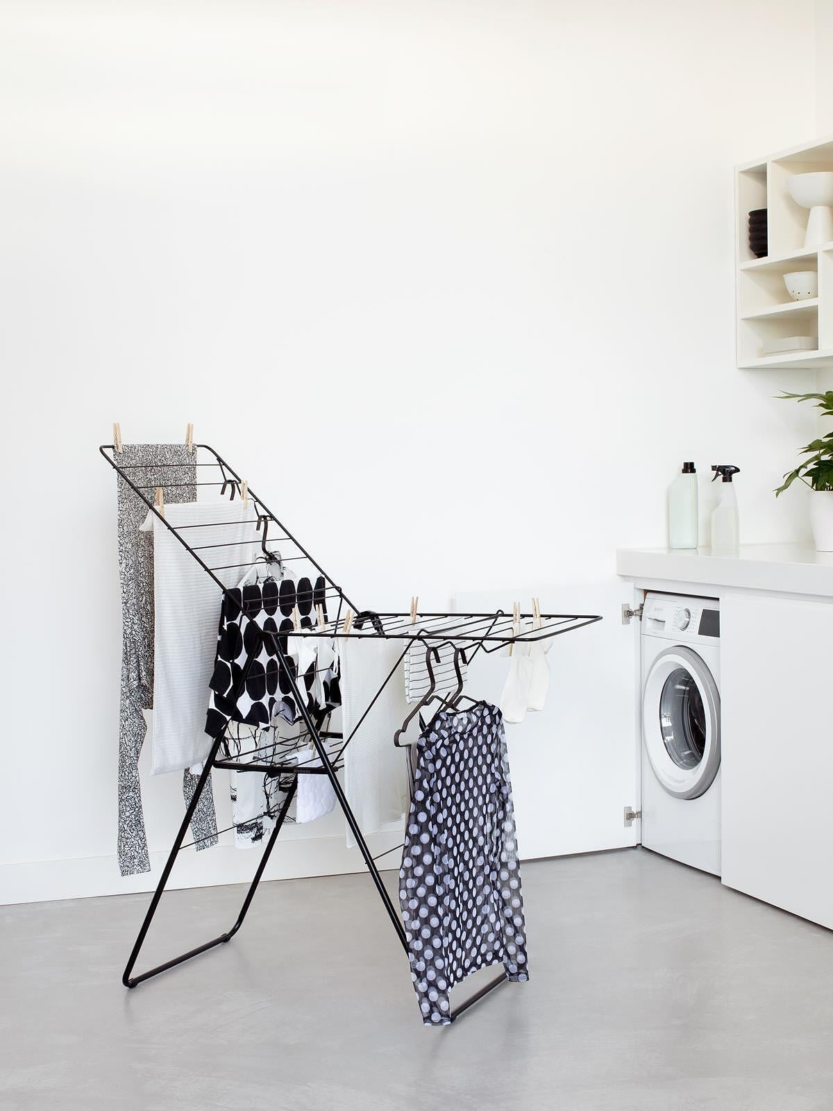 Suszarka posiada 2 rozkładane ramiona z regulacją wysokości oraz centralnie ułożoną dolną półkę - nadaje się do suszenia na płasko delikatnych ubrań.