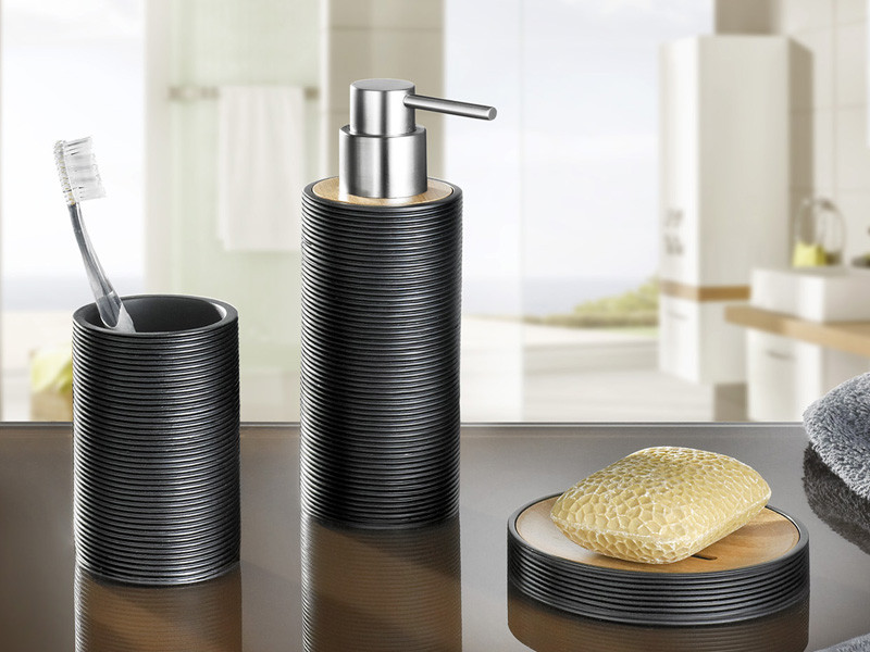 Kolekcja Kyoto to bardzo oryginalne i jednocześnie eleganckie akcesoria, do których wykonania i wykończenia użyto połączenia tworzywa jakim jest poliresin oraz naturalnego bambusa. Połączenie to dodaje niebywałego naturalnego charakteru tym akcesoriom