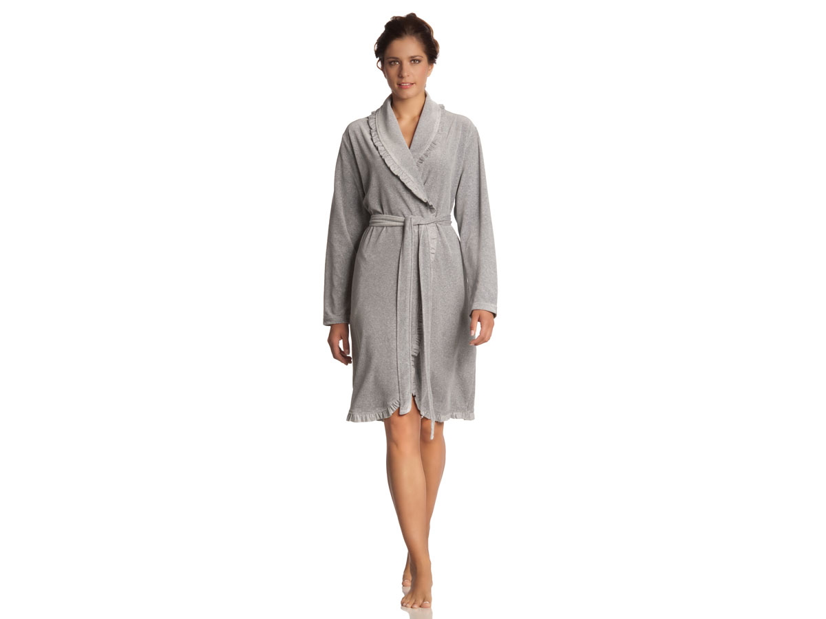 Szlafrok utrzymany jest w jasnoszarej tonacji