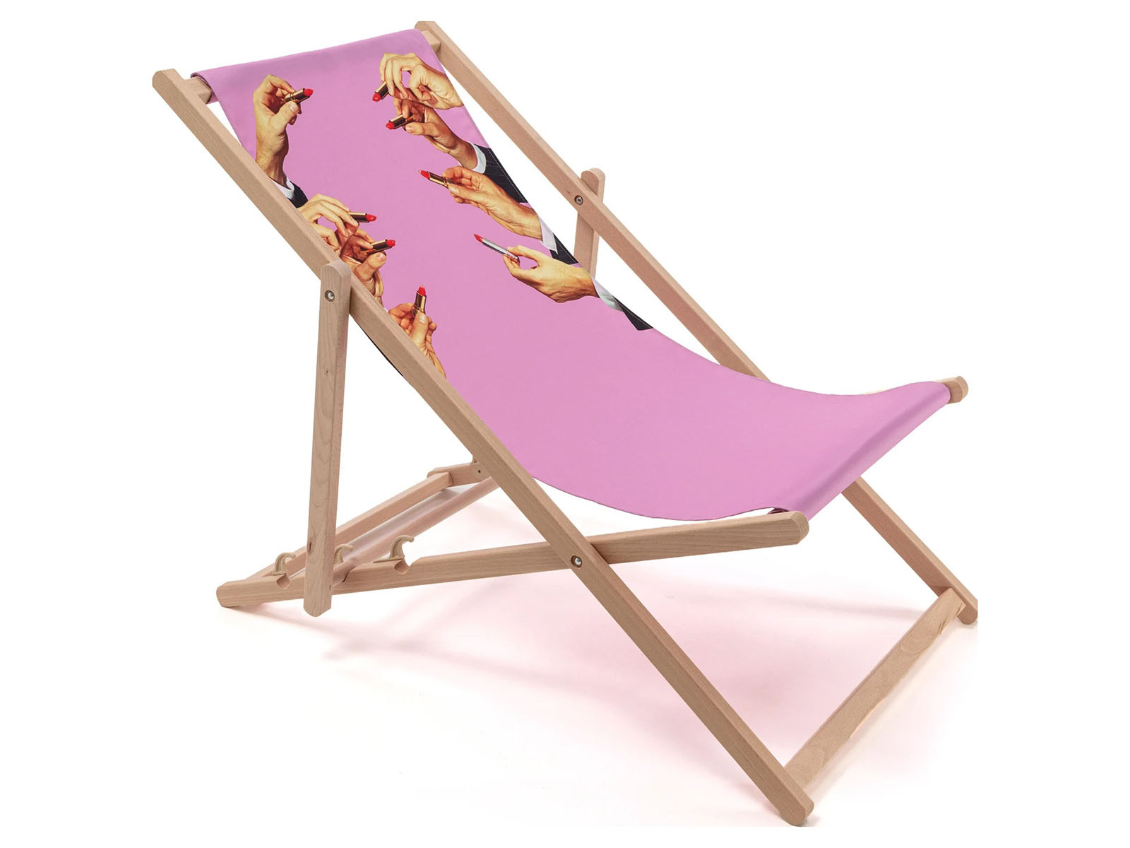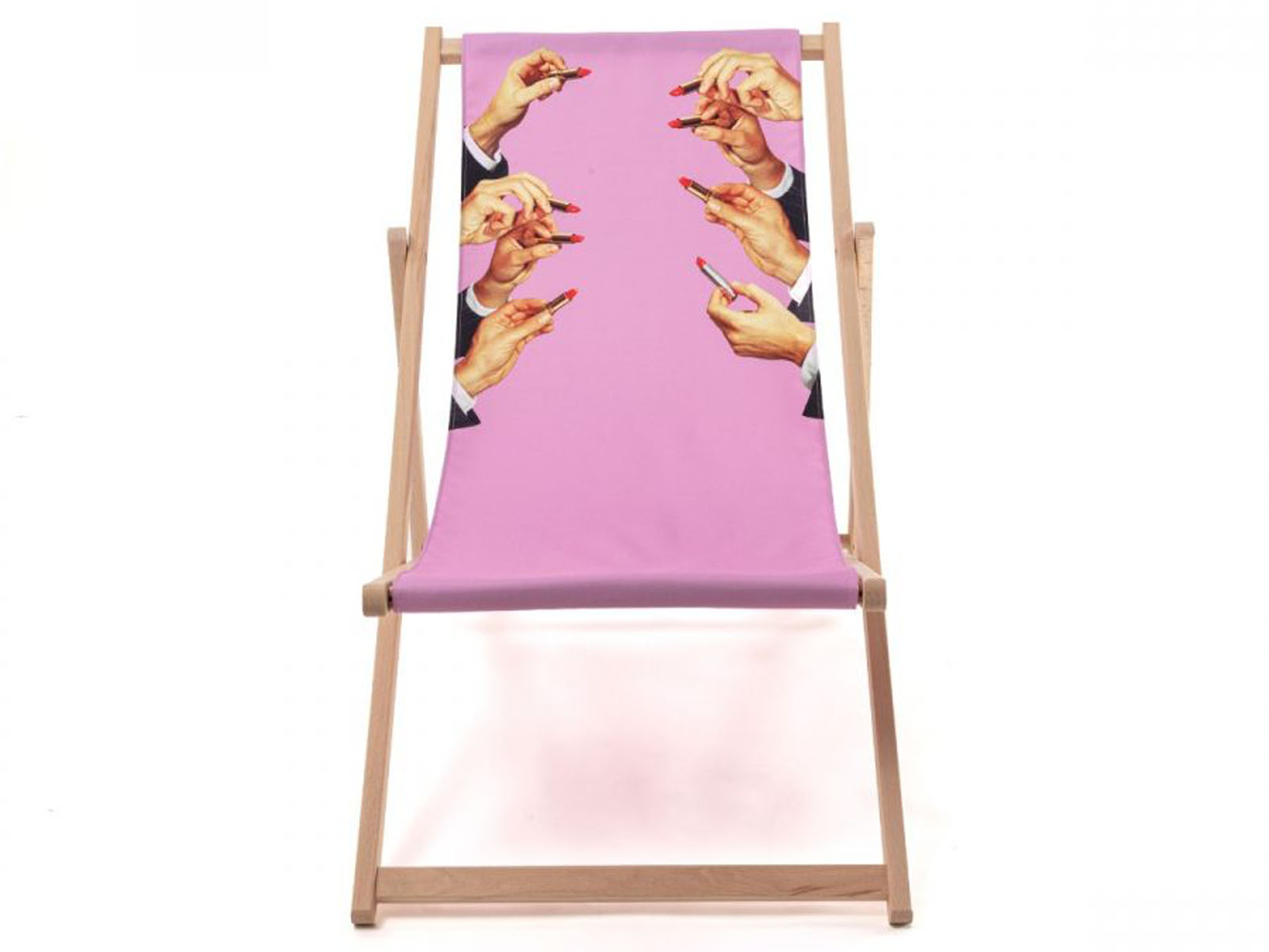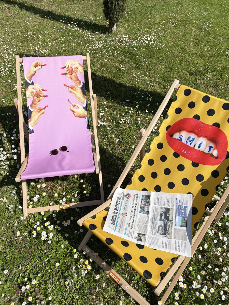 Leżaki plażowe z kolekcji Seletti Toiletpaper to nawiązujące formą stylistyczną do dawnych lat klasyczne składane leżaki o drewnianej konstrukcji i naciągniętym płótnie do siedzenia.