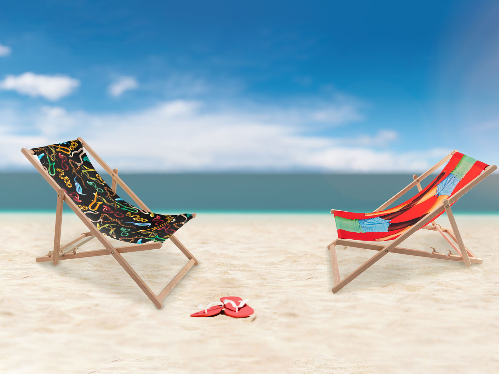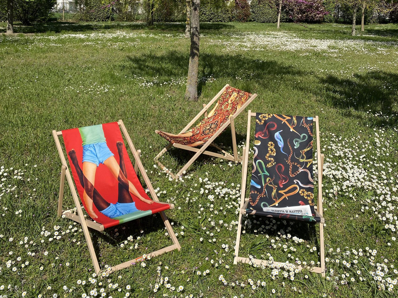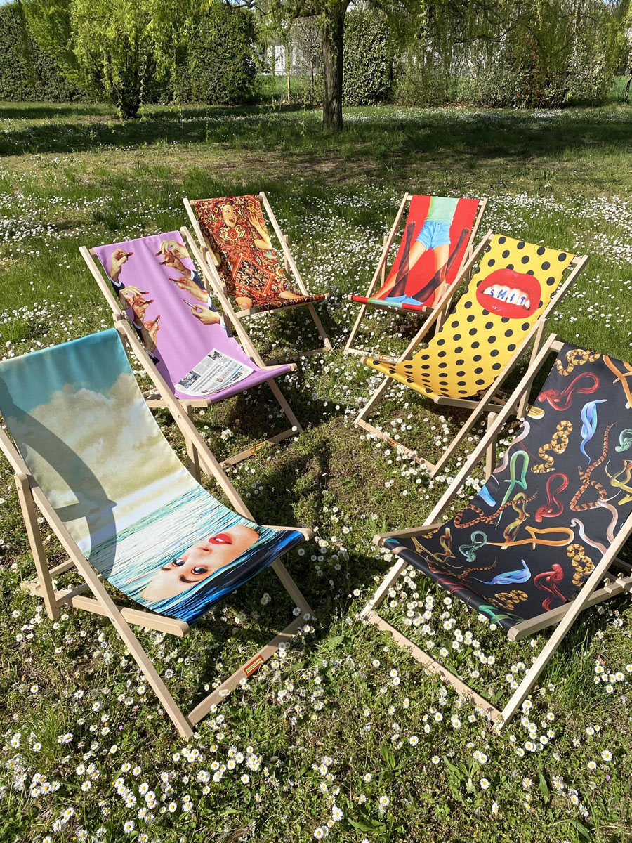 Leżaki plażowe z kolekcji Seletti Toiletpaper to nawiązujące formą stylistyczną do dawnych lat klasyczne składane leżaki o drewnianej konstrukcji i naciągniętym płótnie do siedzenia.