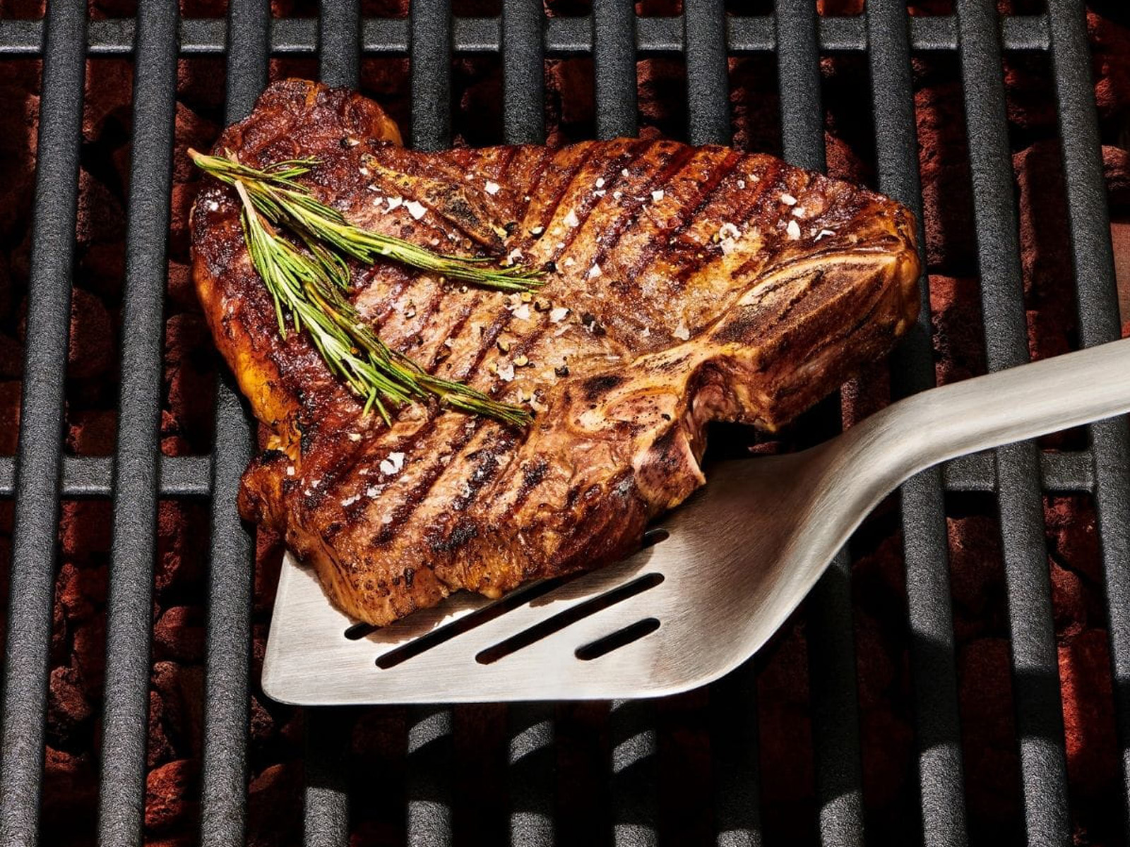 Oryginalna metalowa łopatka grillowa z szeroką skośną ażurową główkę oraz wygiętą konstrukcją ułatwiającą podnoszenie i obracanie porcji mięsa, idealna do grillowania burgerów i steków.