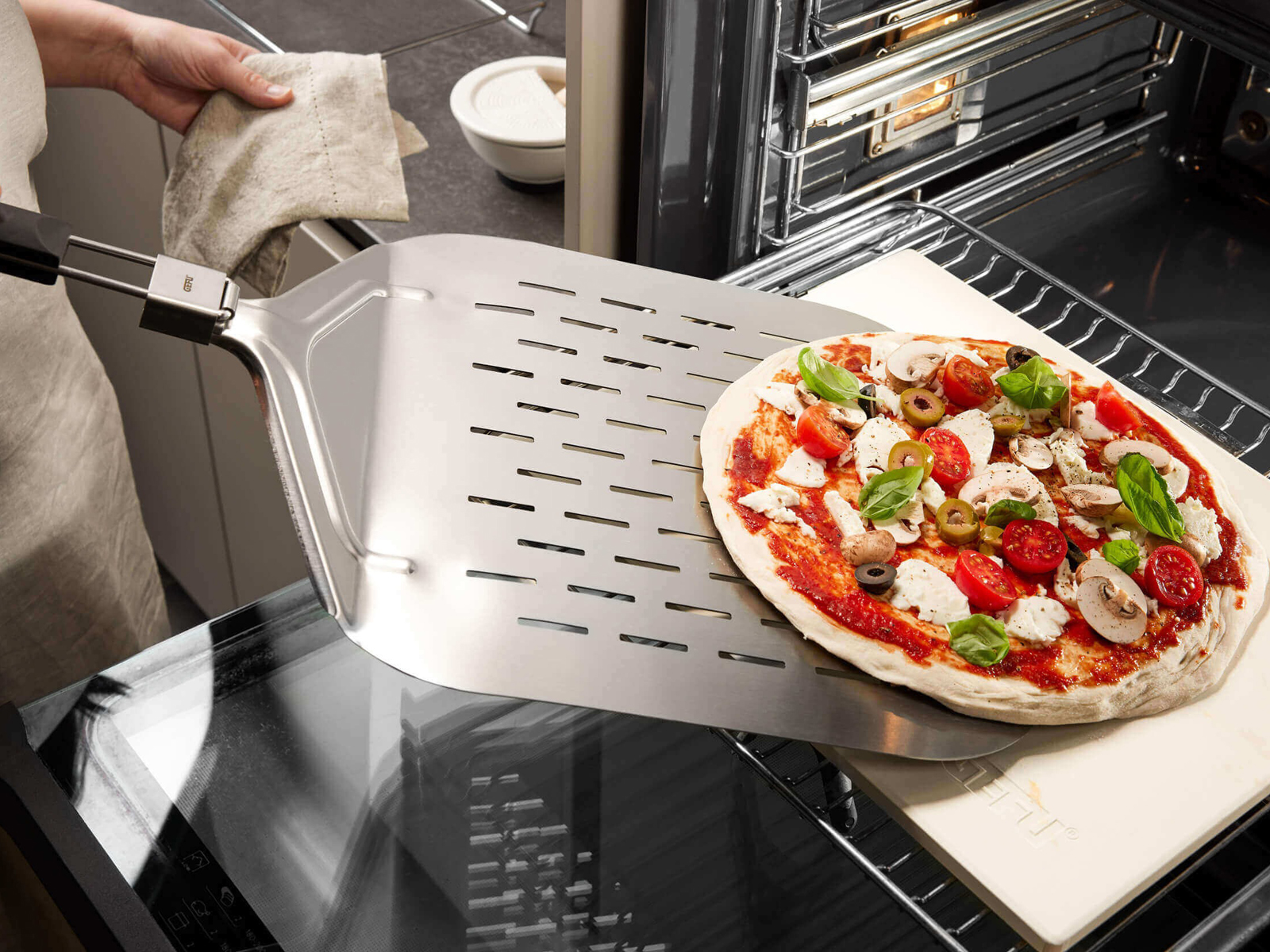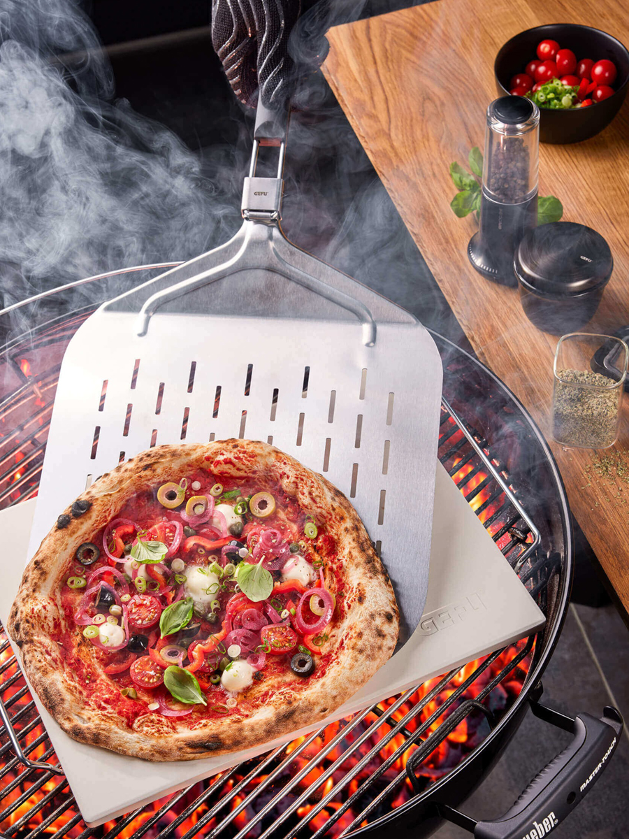 Łopatka do pizzy GEFU Slide to przyrząd zaprojektowany do bezpiecznego przenoszenia pizzy, chleba, tart i ciast na płytę kamienną, talerz czy półmisek. Uniwersalna konstrukcja sprawdza się zarówno w piekarniku, jak i na grillu, a wykonanie ze stali nierdzewnej i tworzywa sztucznego zapewnia trwałość oraz możliwość mycia w zmywarce. Gładka, perforowana powierzchnia umożliwia sprawne zsuwanie wypieków, a płaski kształt – zachowanie stabilnego podparcia podczas przenoszenia. Składany, ergonomiczny uchwyt z oczkiem gwarantuje bezpieczną obsługę i oszczędność miejsca podczas przechowywania w szafkach lub wieszania na relingu kuchennym.