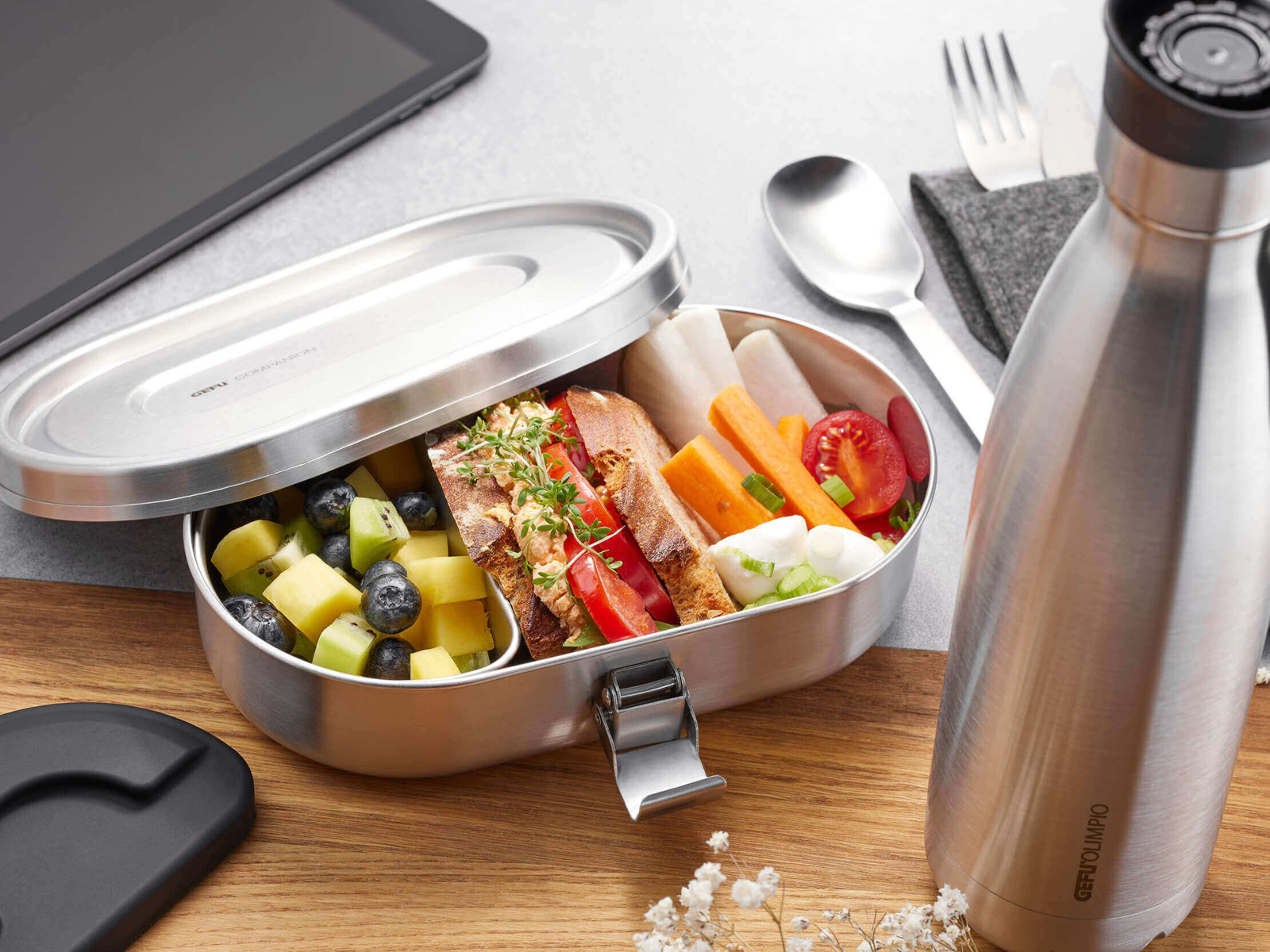 Lunchbox GEFU Companion to praktyczny pojemnik dla osób, które cenią porządek i różnorodność w jedzeniu. System bento box umożliwia przechowywanie kilku dań w osobnych przegrodach, dzięki czemu ich smaki nie mieszają się ze sobą. Dodatkowo wbudowany, mniejszy pojemnik z pokrywką pozwala trzymać owoce, warzywa lub dipy w oddzielnym miejscu, a szczelna uszczelka i zamknięcie na zatrzask zapewniają pełne bezpieczeństwo w transporcie. Konstrukcja ze stali nierdzewnej i silikonu gwarantuje trwałość, odporność na uszkodzenia oraz możliwość mycia w zmywarce.