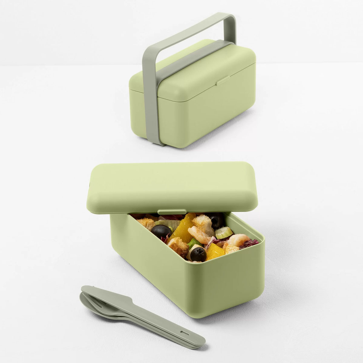 Wewnętrzny, ruchomy separator dzieli żywność, aby zachować ich najlepszy smak i konsystencję. Specjalny otwór odpowietrzający umożliwia równomierne nagrzewanie i bezpieczne użytkowanie w mikrofalówce. Hermetyczna pokrywa z otworem na słuchawki lub kabel do ładowania smartfona, staje się zarazem stabilną podstawką pod telefon. Łatwe zamykanie i otwieranie nie powodują szarpnięcia i przemieszczania się jedzenia wewnątrz. Dodatkowym zabezpieczeniem przed otwarciem jest efektowny pasek, który służy równie do wygodnego przenoszenia twojego posiłku. Zestaw zawiera sztućce, które kompaktowo umieszczone są na wierzchniej części pojemnika tuż pod pokrywą główną.