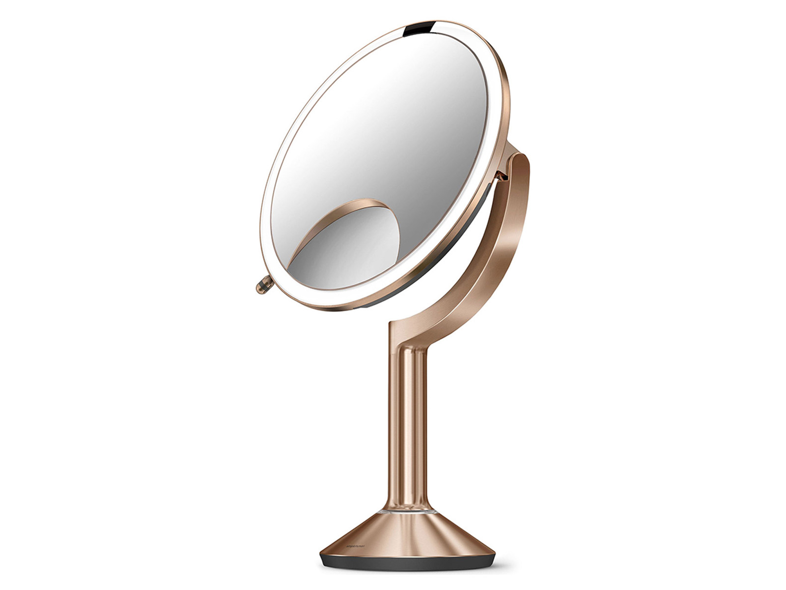 Eleganckie nablatowe wolnostojące lusterko kosmetyczne z 3 strefami powiększenia 1x, 5x i 10x oraz z automatycznym podświetleniem z regulacją jasności światła.