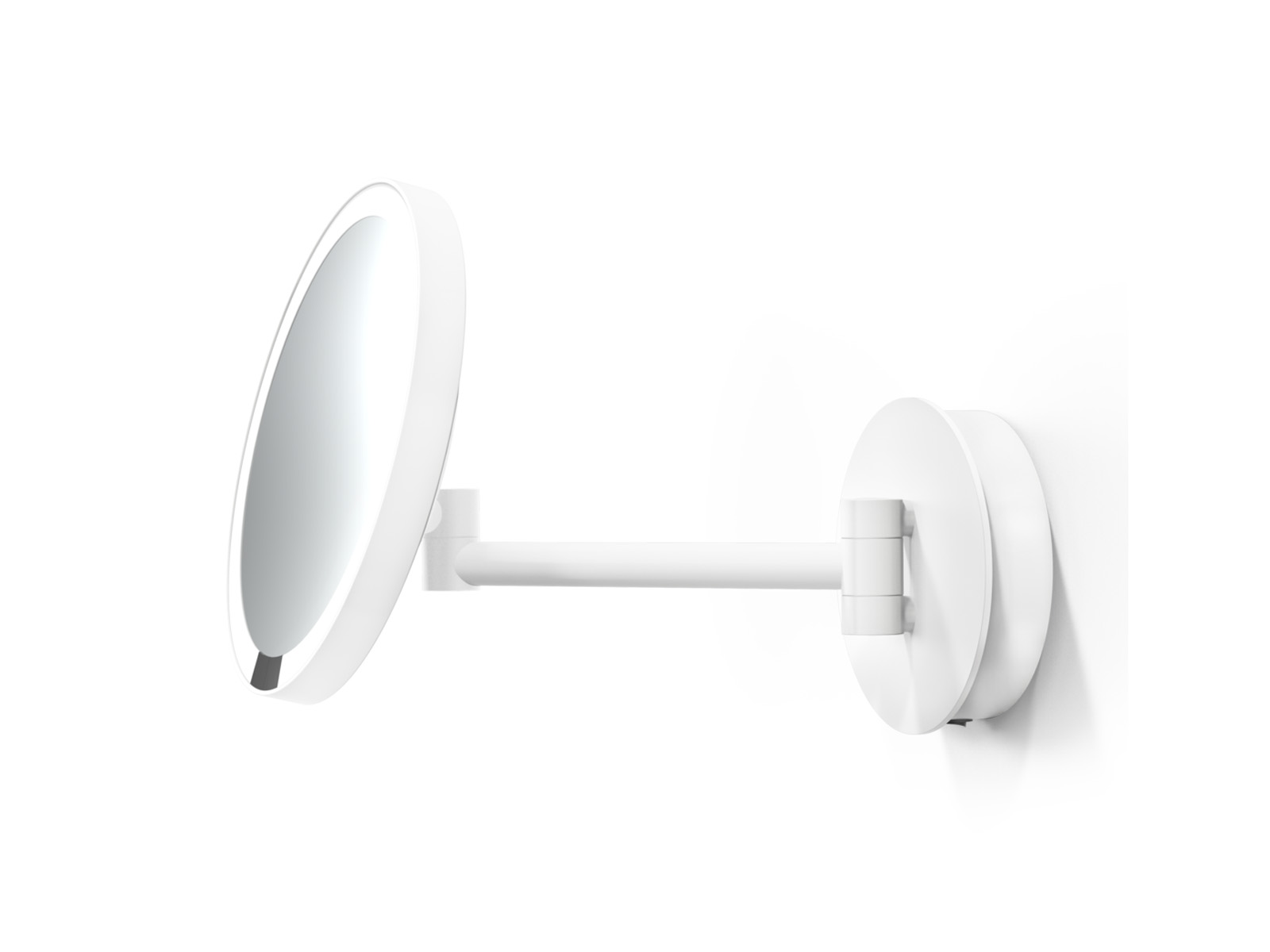Konstrukcja lusterka wykonana z lakierowanej stali nierdzewnej w wykończeniu matowym z ruchomym ramieniem umocowanym na okrągłej podstawie.