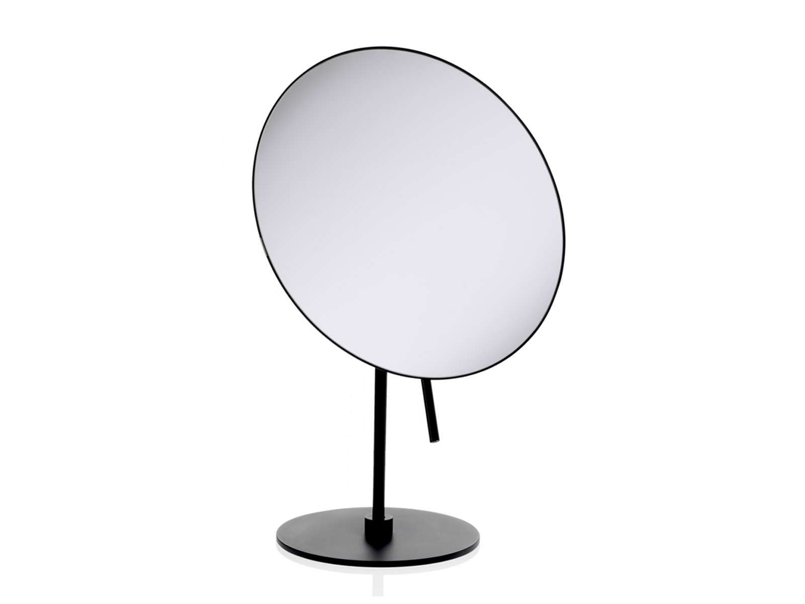 Konstrukcja lusterka wykonana z lakierowanego metalu w wykończeniu matowym ze smukłą nóżką osadzoną na okrągłej podstawie.