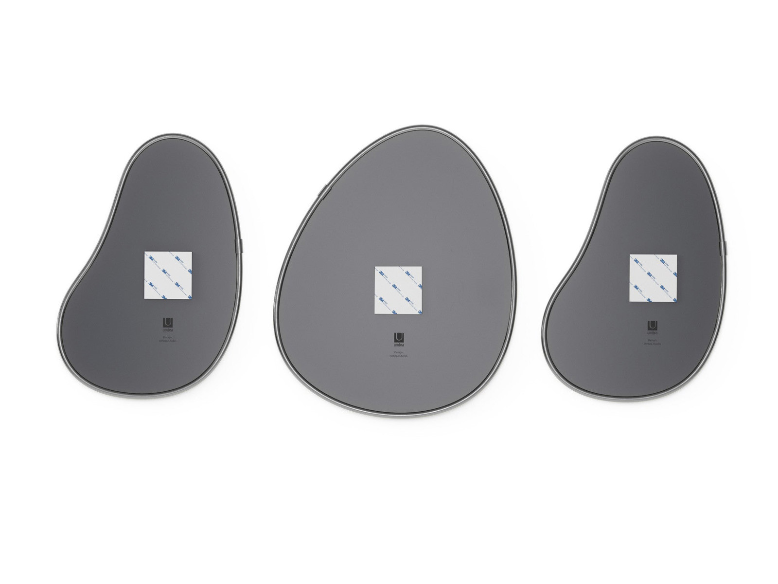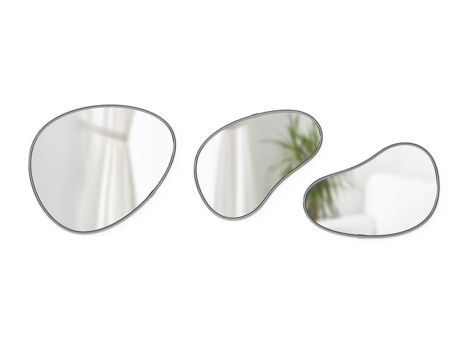 Oryginalna ozdobna kompozycja ścienne składająca się z 3-ech niedużych luster o oryginalnym nieregularnym kształcie z brzegiem wykończonym wąską metalową ramą w wykończeniu tytanowym.