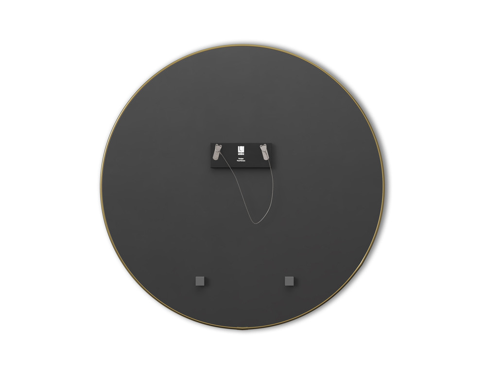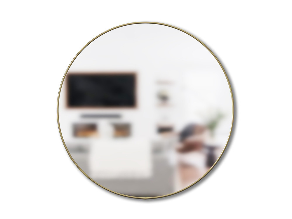 Eleganckie uniwersalne okrągłe lustro ścienne z brzegiem wykończonym wąską ozdobną metalową ramą w wykończeniu mosiężnym.