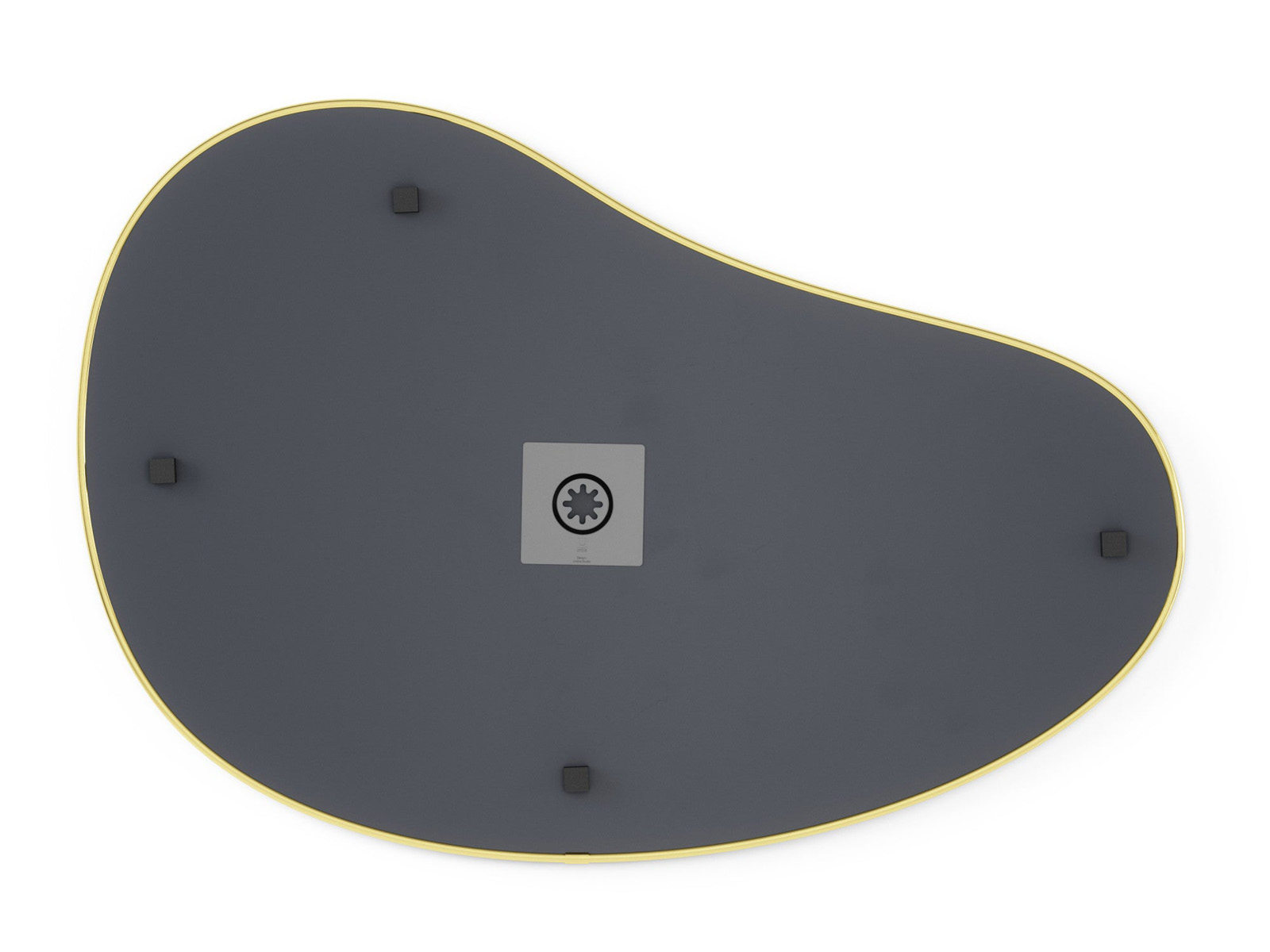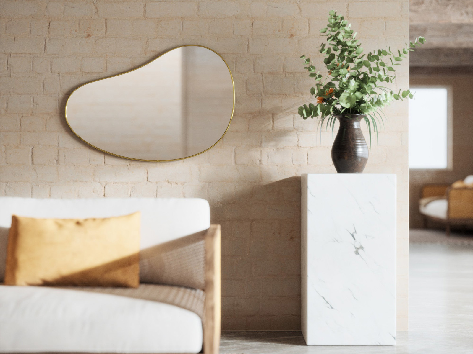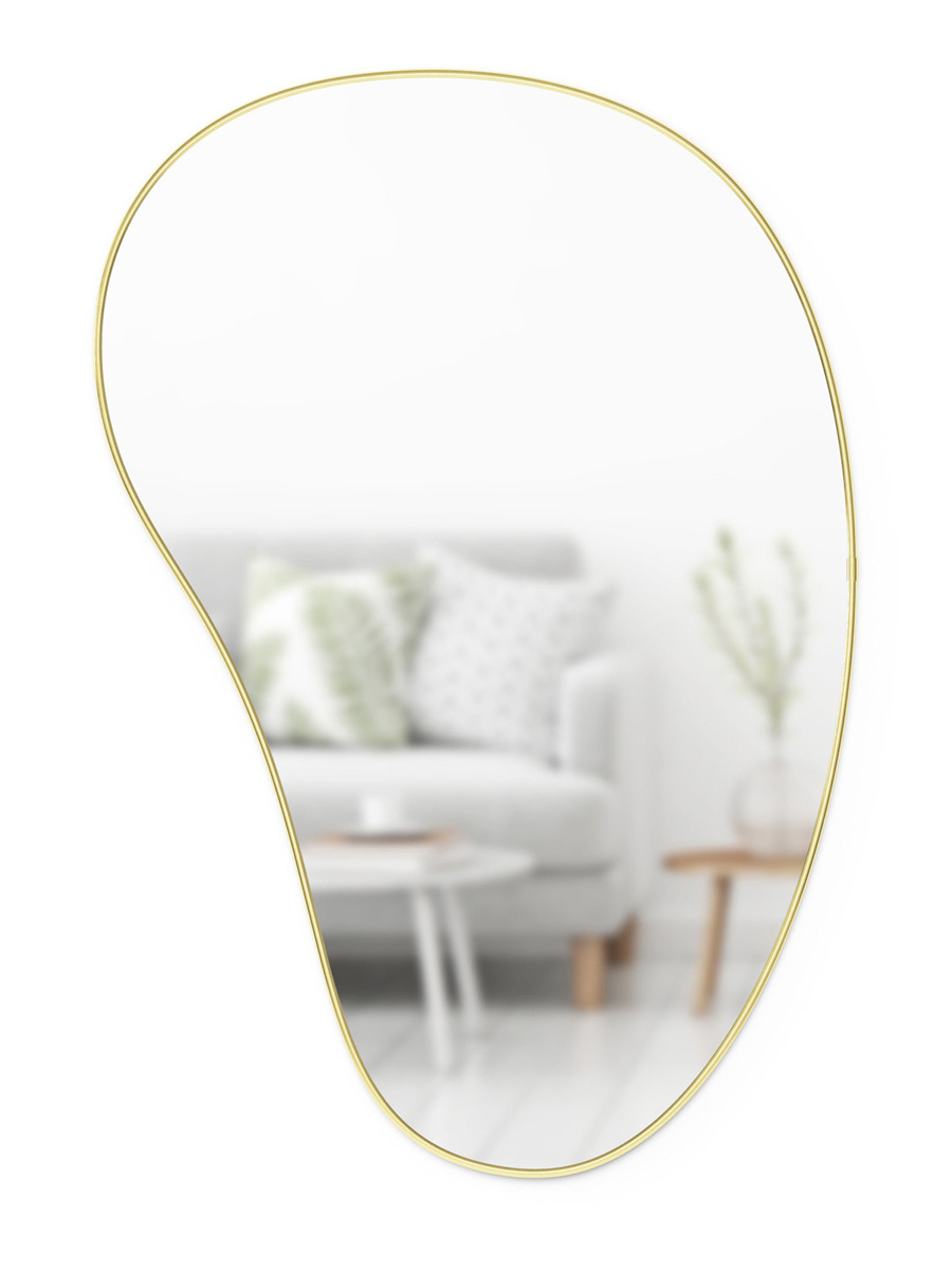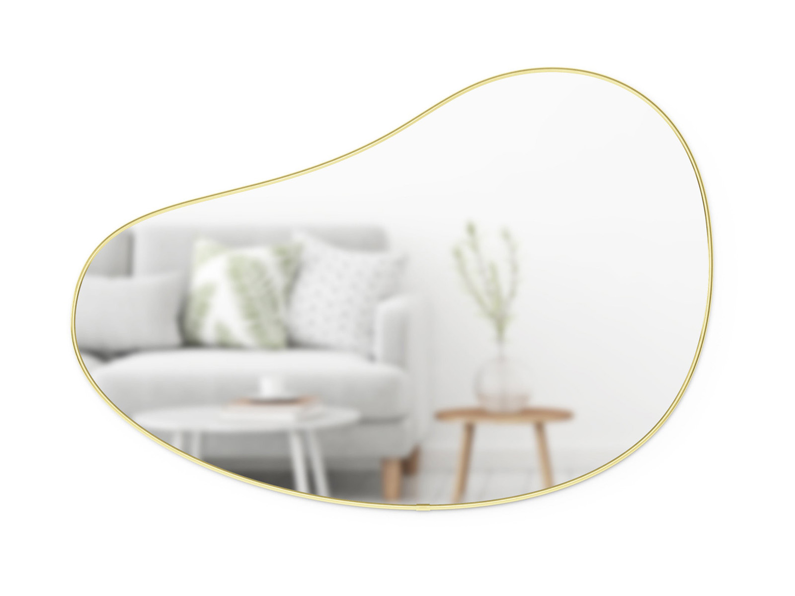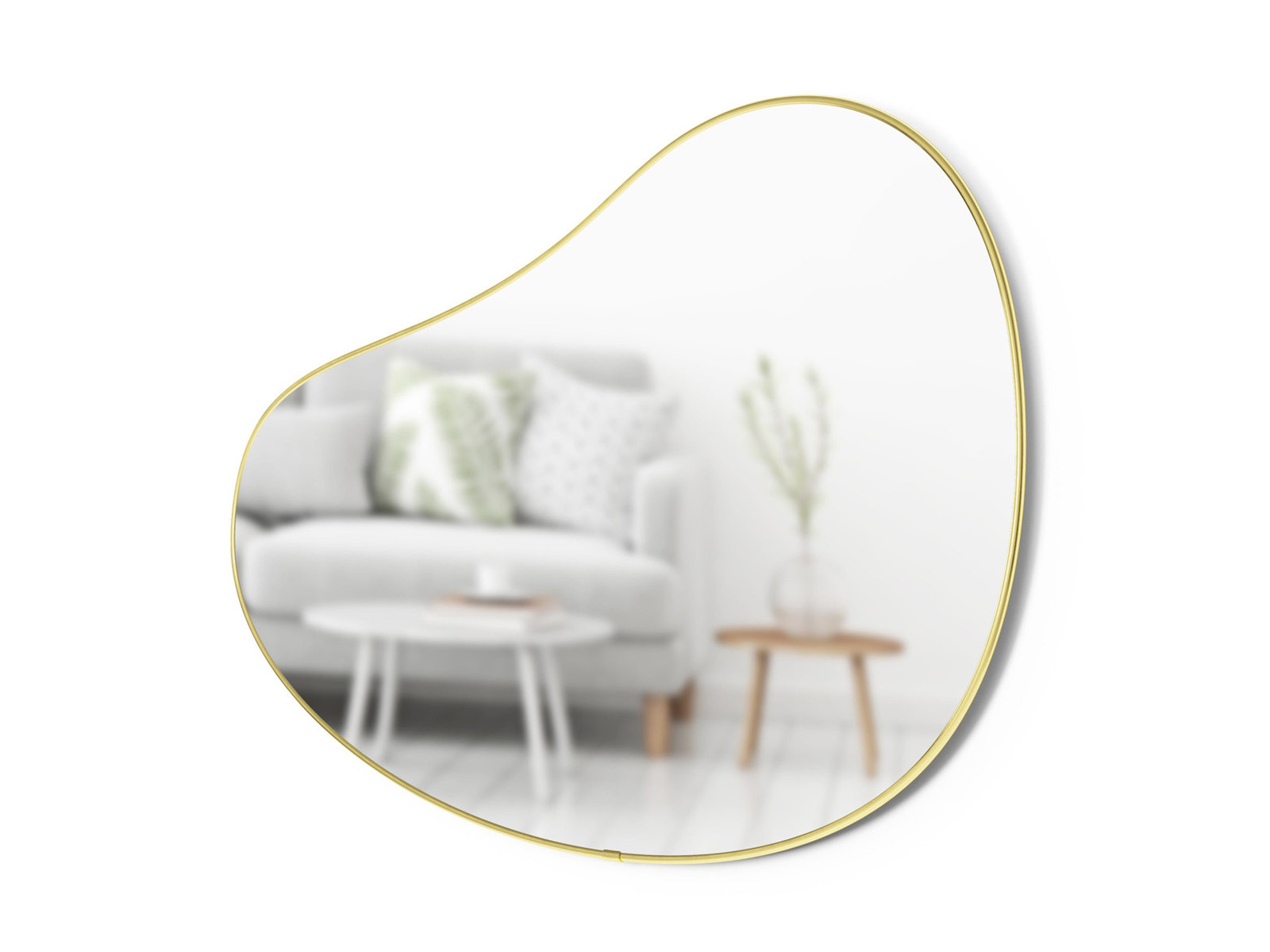 Eleganckie dekoracyjne lustro ścienne o oryginalnym nieregularnym kształcie z brzegiem wykończonym wąską metalową ramą w wykończeniu mosiężnym.
