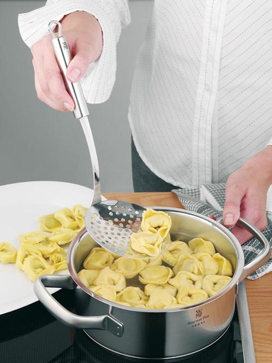 Duża perforowana główka pozwala na szybkie odcedzanie z płynów, a dzięki jej płaskiemu kształtowi łyżka nadaje się również do zbierania powierzchniowych sadów oraz nadmiaru tłuszczów i białek.