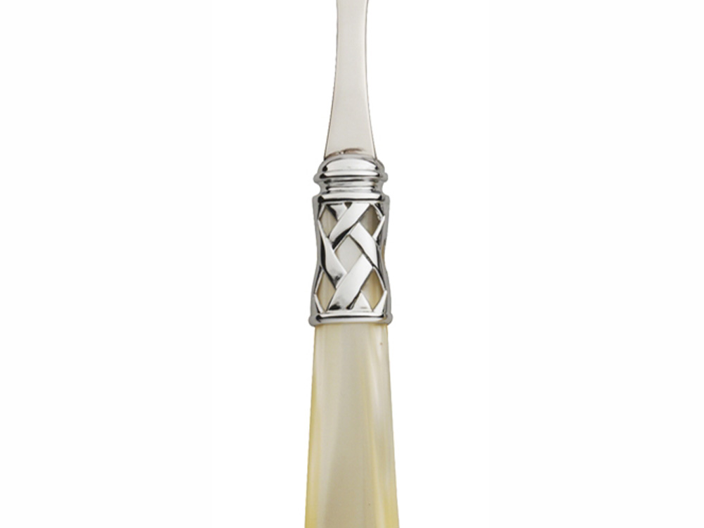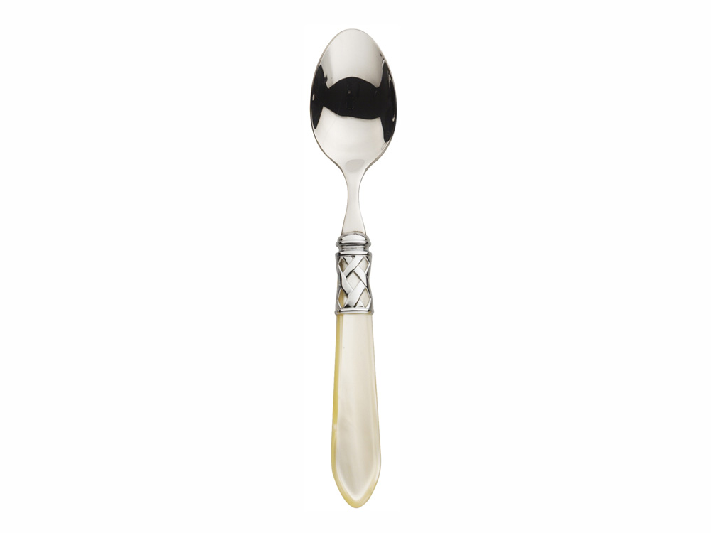Piękna ozdobna łyżka deserowa wykonana z wysokiej jakości stali nierdzewnej z akrylowym trzonkiem w kolorze perłowej kości słoniowej.