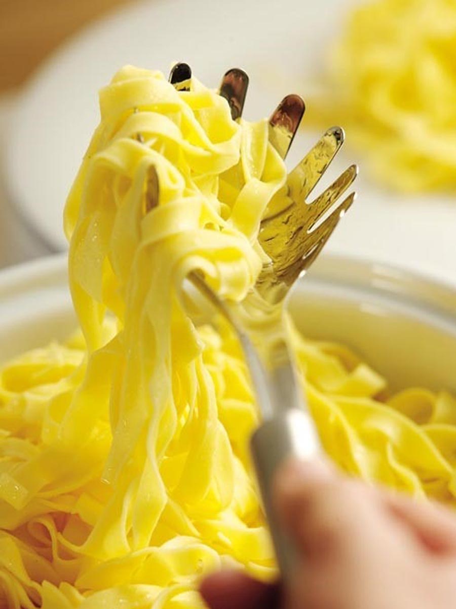 Elegancka i praktyczna specjalna łyżka do wyjmowania z wody i serwowania długiego makaronu: spaghetti, linguine czy tagliatelle.