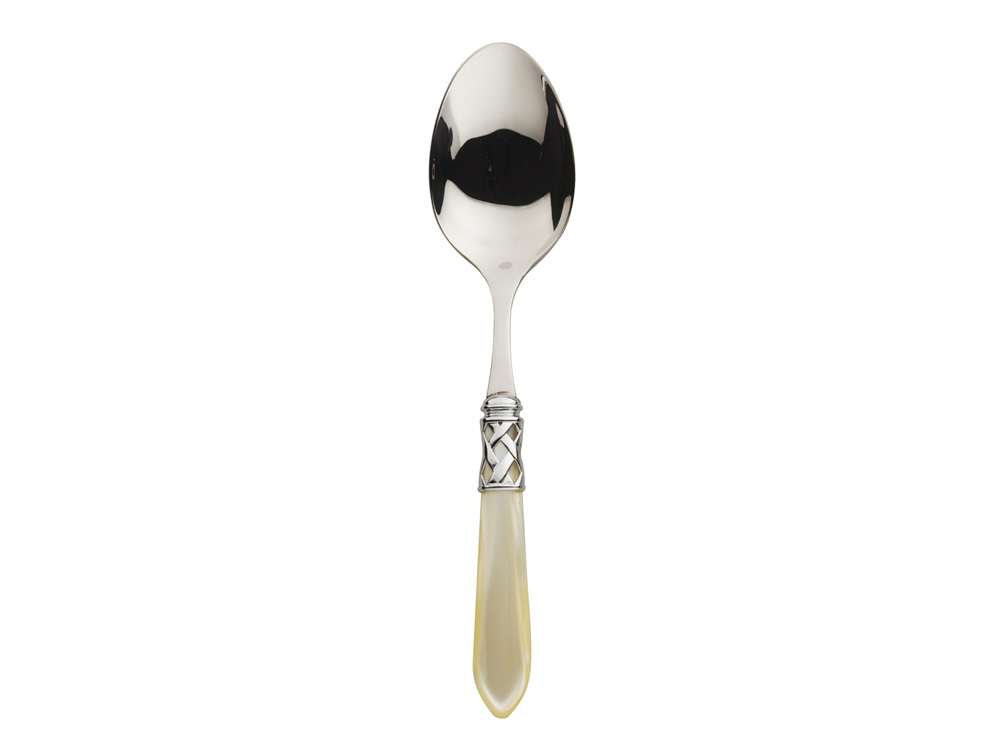Piękna ozdobna łyżka stołowa obiadowa wykonana z wysokiej jakości stali nierdzewnej z akrylowym trzonkiem w kolorze perłowej kości słoniowej.