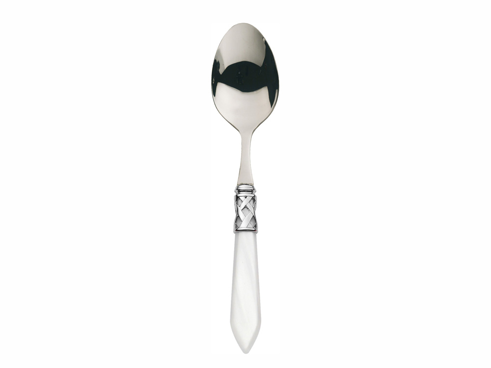 Piękna ozdobna łyżka stołowa obiadowa wykonana z wysokiej jakości stali nierdzewnej z akrylowym trzonkiem w kolorze perłowej bieli.