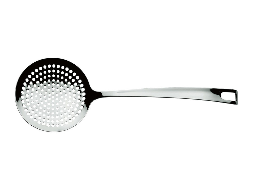 Łyżka z niewielkimi dziurkami wykonana z wysokiej jakości stali nierdzewnej o lekko profilowanej ergonomicznej rączce zakończonej oczkiem do zawieszania.