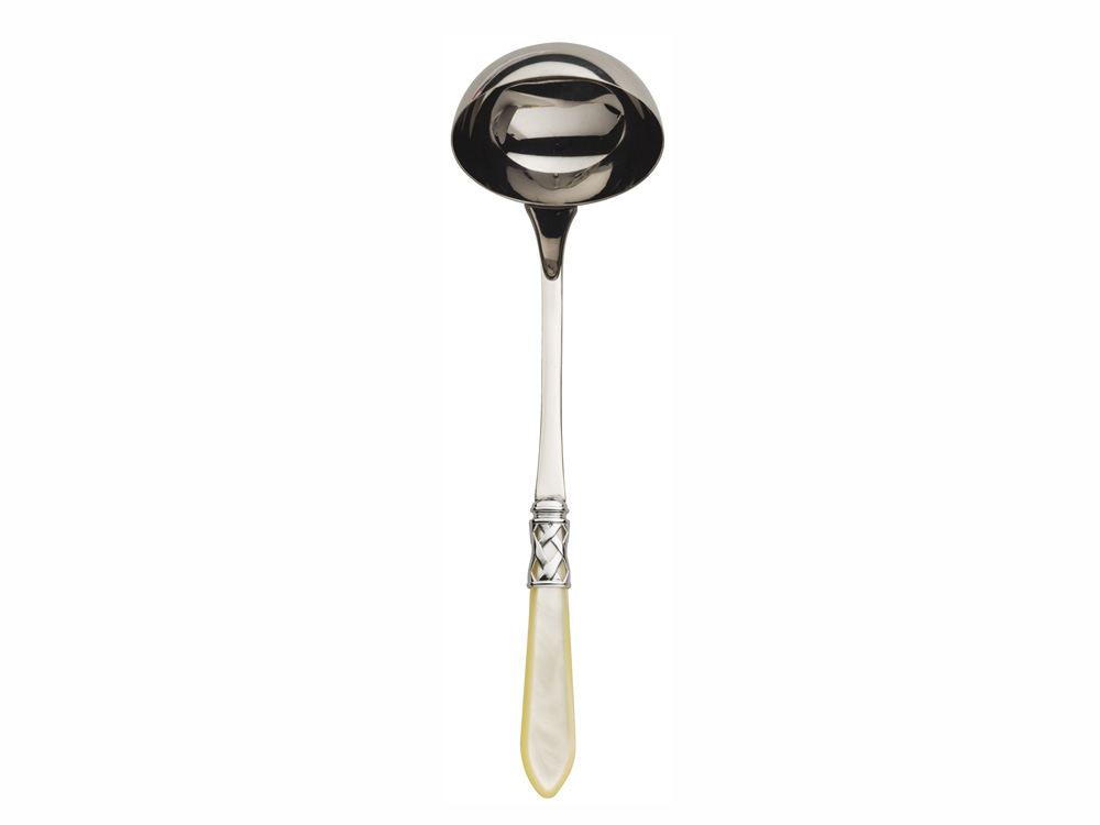 Łyżka wykonana z wysokiej jakości stali nierdzewnej z akrylowym trzonkiem w kolorze perłowej kości słoniowej.