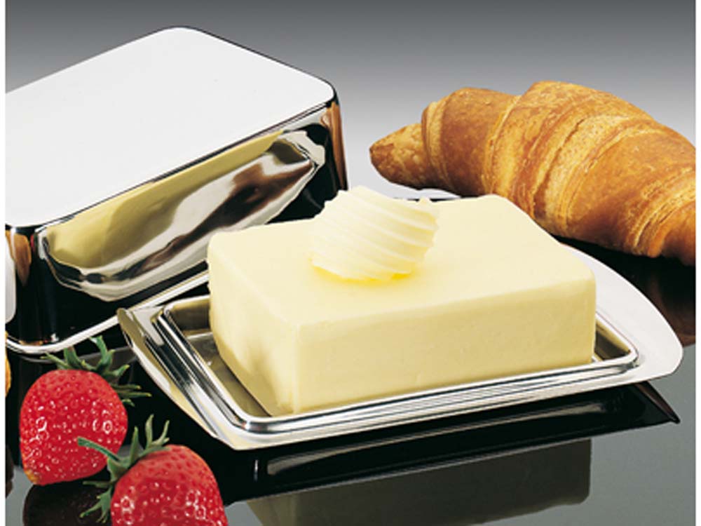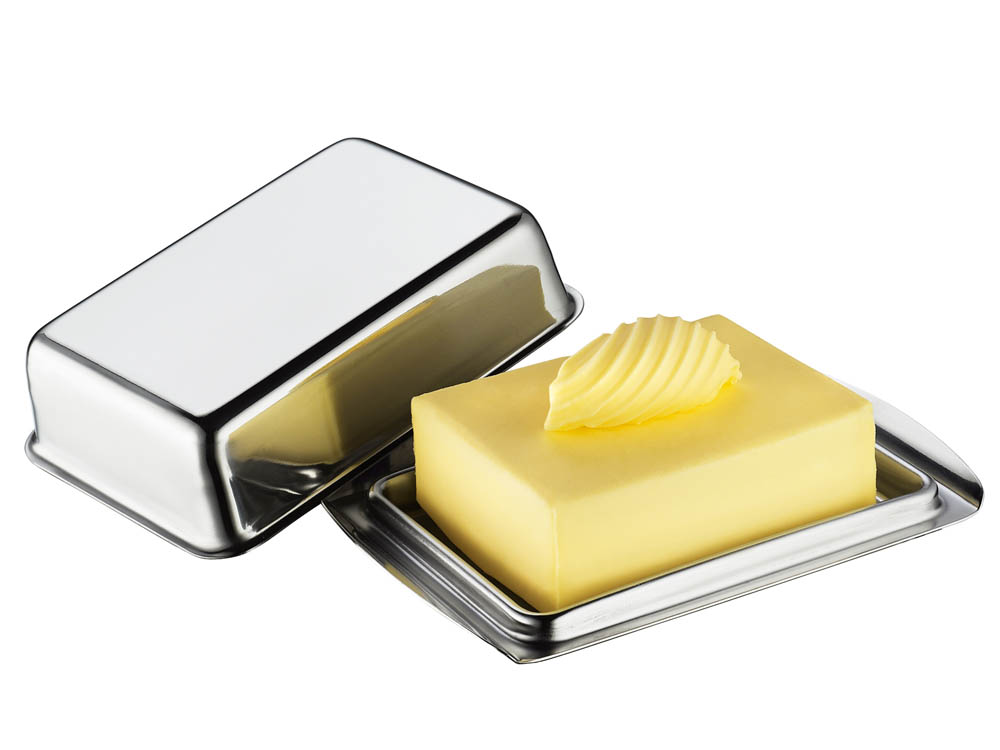 Elegancka polerowana na wysoki połysk maselniczka wykonana z wysokiej jakości higieniczna i neutralna dla żywności stali nierdzewnej.