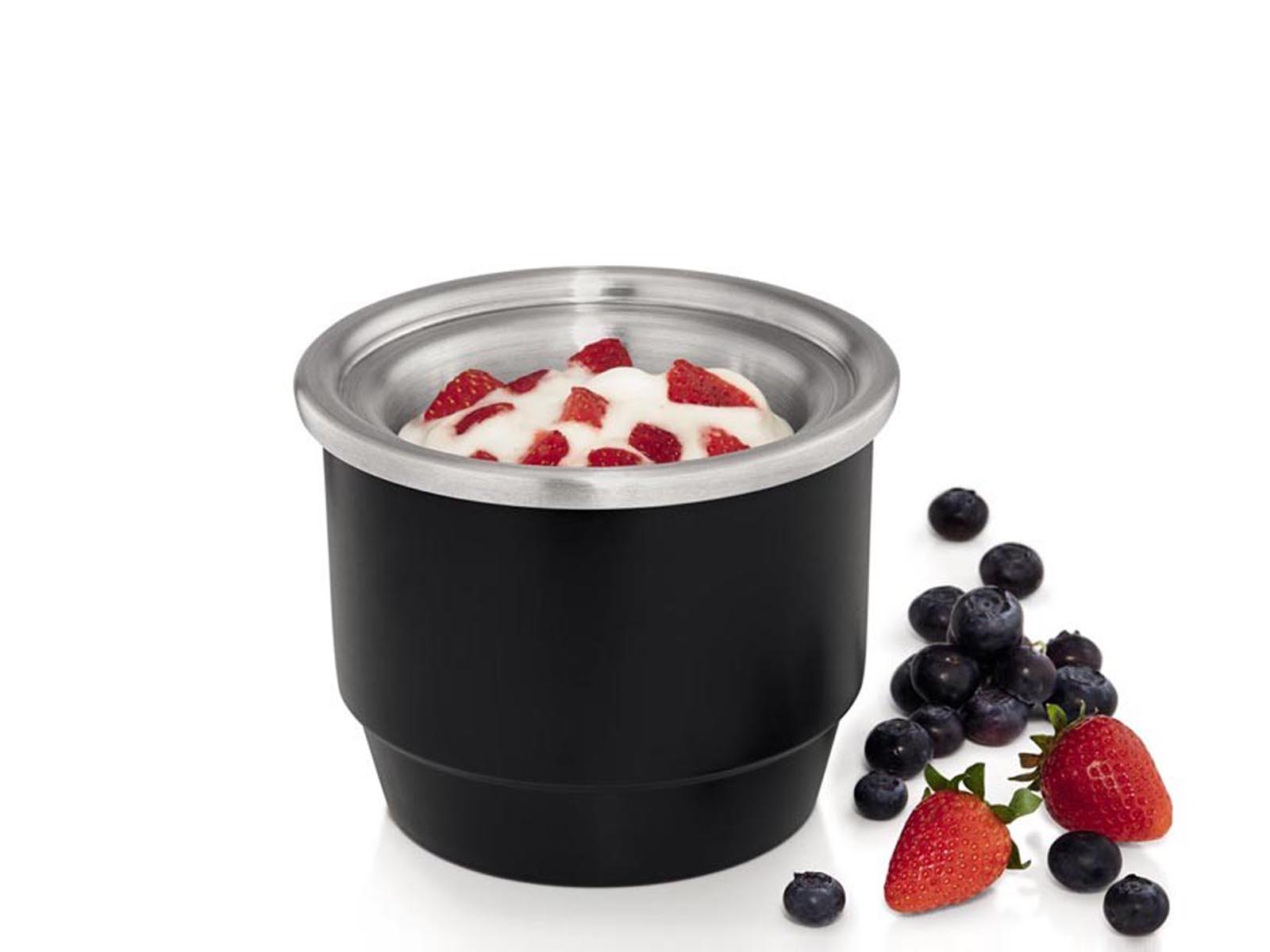 Eleganckie elektryczne urządzenie kuchenne maszynka do przygotowywania lodów, sorbetów i mrożonego jogurtu w komplecie z pojemnikiem do mrożenia i przechowywania przygotowanych deserów oraz stalową łyżka do ich nakładania.