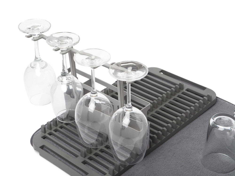 Podręczna prostokątna składana mata z suszarką zawierającą ociekacza na talerze, pojemnik na sztućce oraz uchwyt do zawieszania kieliszków.