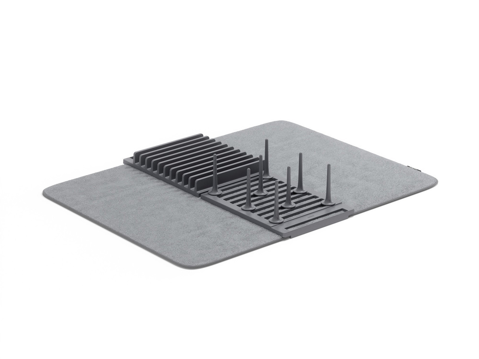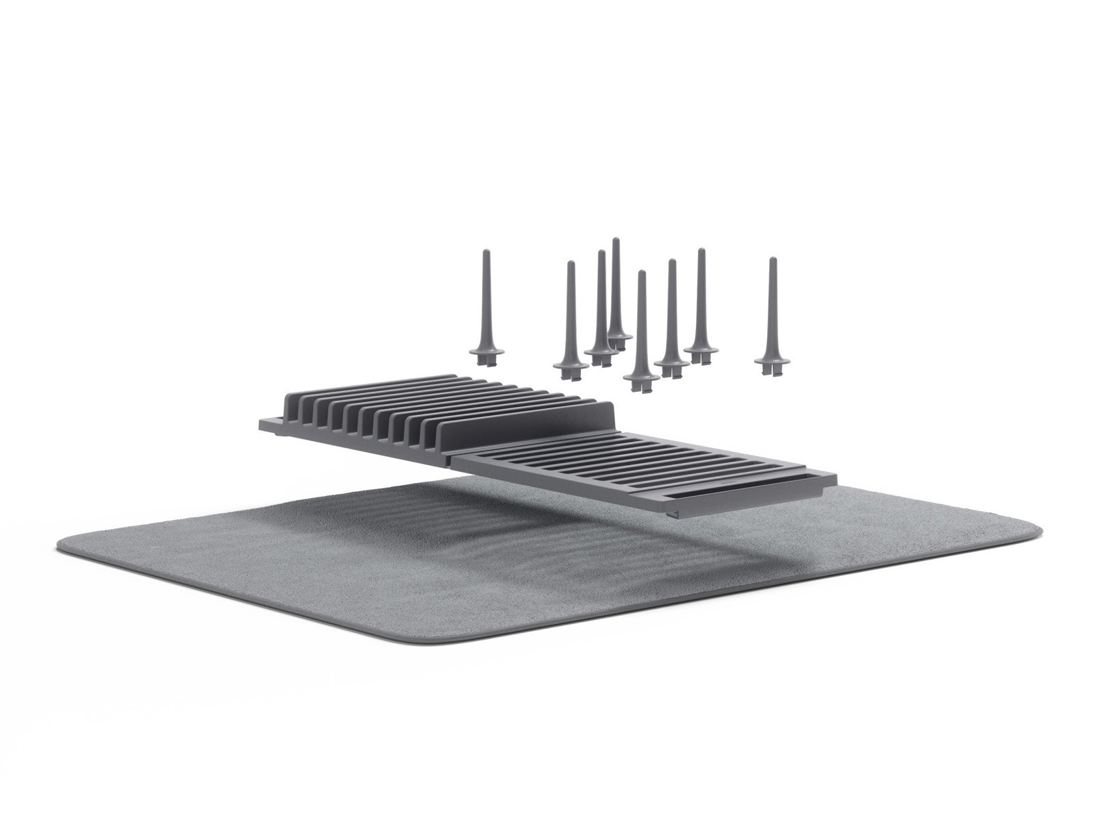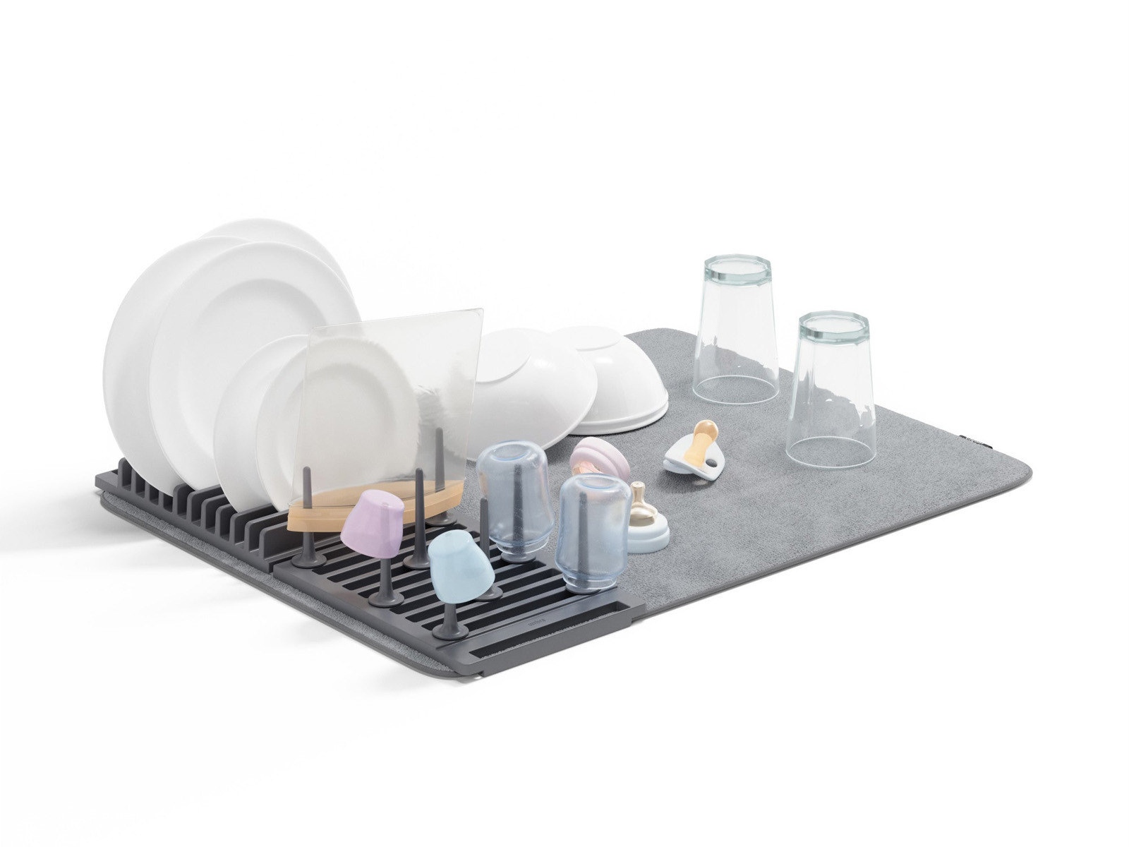 Mata wykonana z mikrofibry specjalnego szybkoschnącego materiału, pochłania wodę z suszących się naczyń, jednocześnie chroniąc blat przed zadrapaniami i gromadzeniem się wody. Suszarka i kołki wykonane z tworzywa sztucznego niezawierającego BPA.