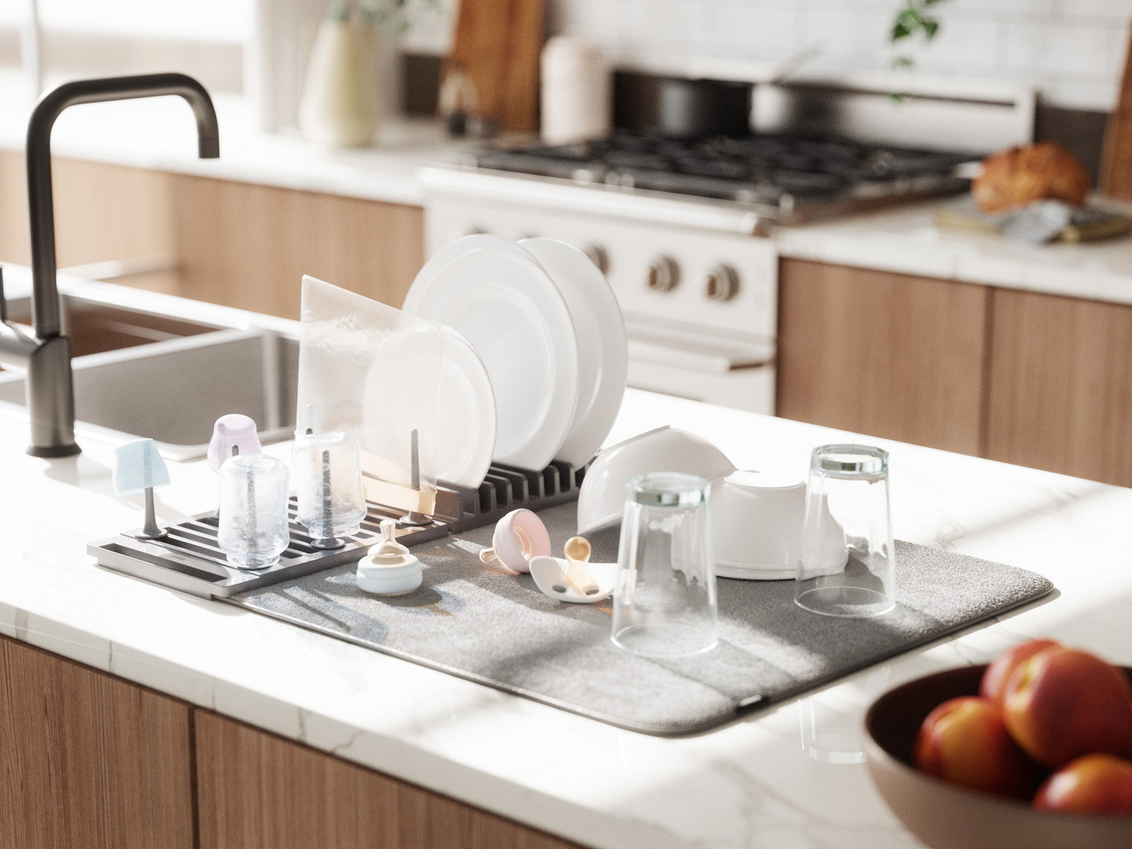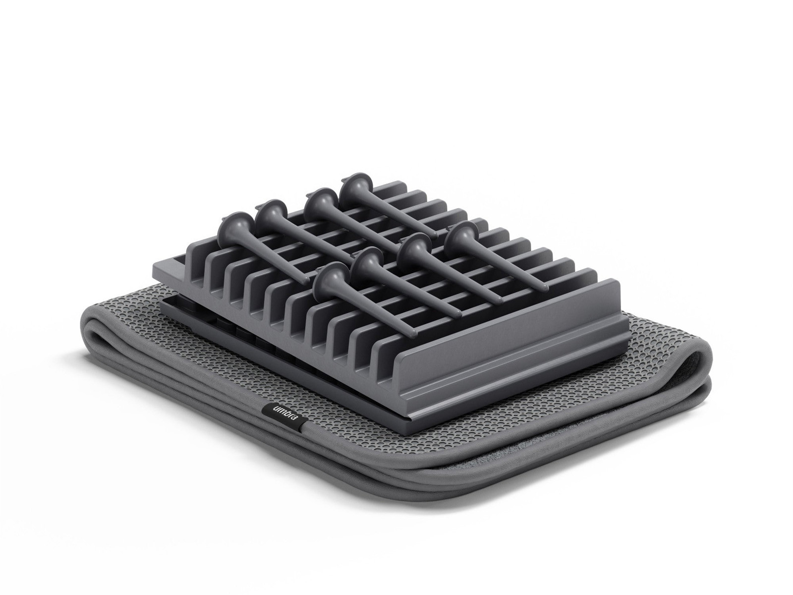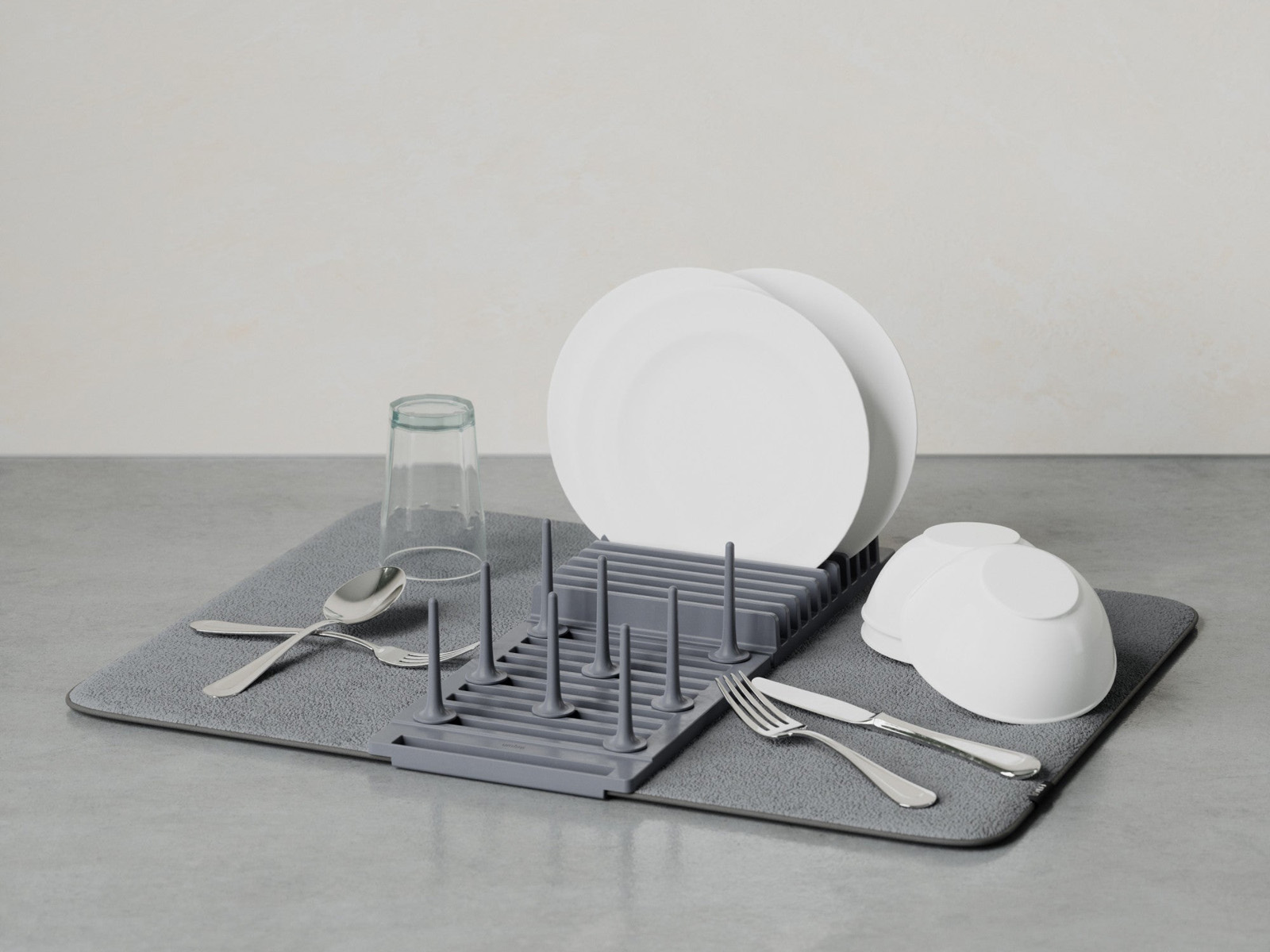 Mata wykonana z mikrofibry specjalnego szybkoschnącego materiału, pochłania wodę z suszących się naczyń, jednocześnie chroniąc blat przed zadrapaniami i gromadzeniem się wody. Suszarka i kołki wykonane z tworzywa sztucznego niezawierającego BPA.