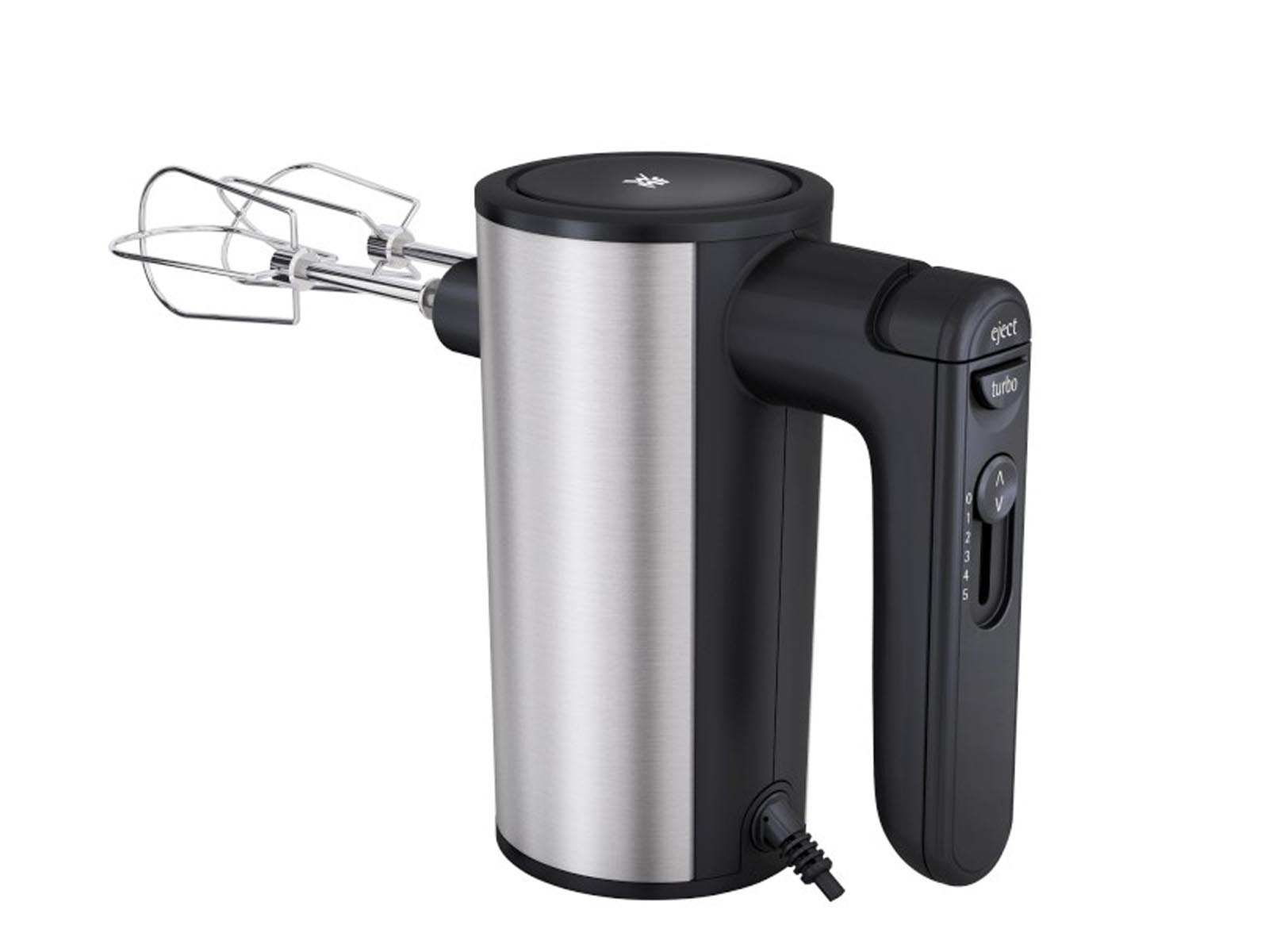 Elegancki elektryczny kuchenny mikser ręczny do mieszania i ubijania miękkich oraz płynnych produktów spożywczych, a także do ugniatania średniej twardości ciast.