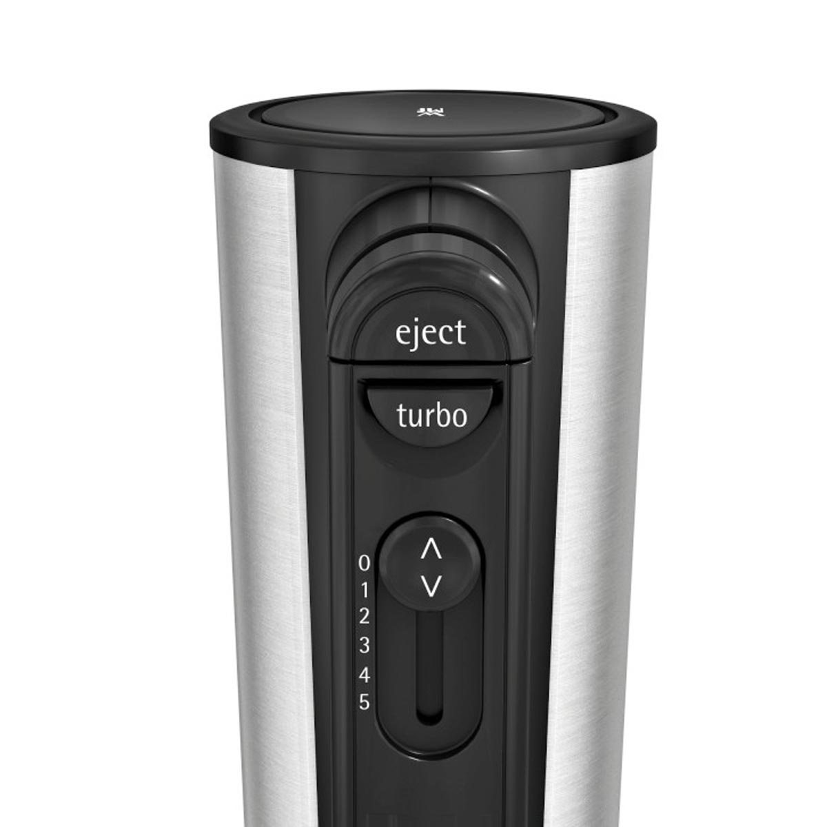 Mikser posiada 5 poziomów prędkości, funkcję turbo przydatną do szybkiego ubicia śmietany lub piany z białek oraz prosty i bezpieczny mechanizm wyjmowanie końcówek roboczych za pomocą jednego przycisku uwalniającego.